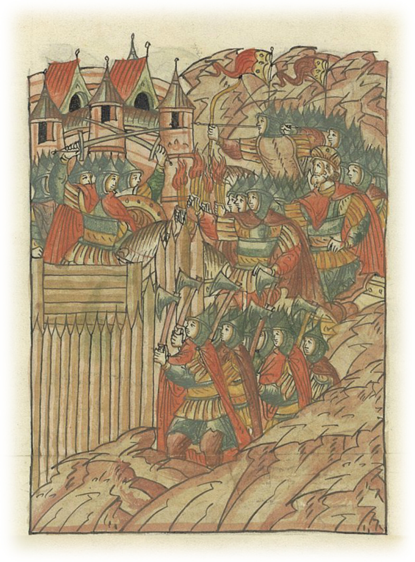 Князь же Святослав, придя к городу, выставил людей вперед с огнем и с секирами, за ними стрельцов и копейников, и приступил к городу. И была брань между ними крепкая.