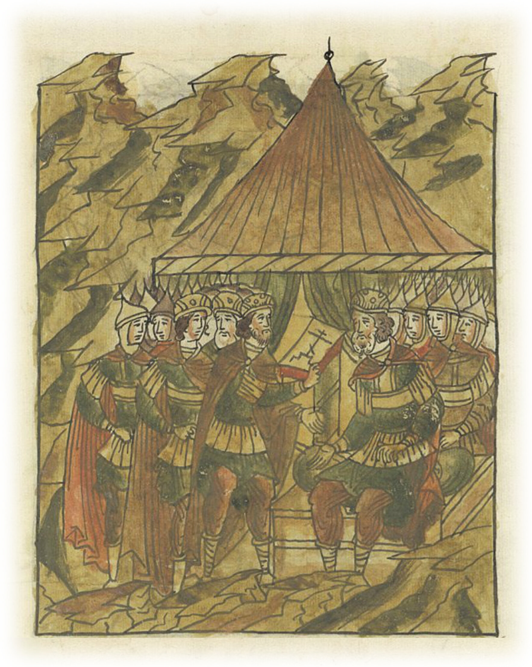 О побоище князя Ярослава Всеволодовича с князем Новгородским Мстиславом Мстиславичем у Липицы. Князья Мстислав Мстиславич, Владимир Смоленский, Владимир Псковский и Всеволод Мстиславич призывают князя Константина Всеволодовича подтвердить свою верность и