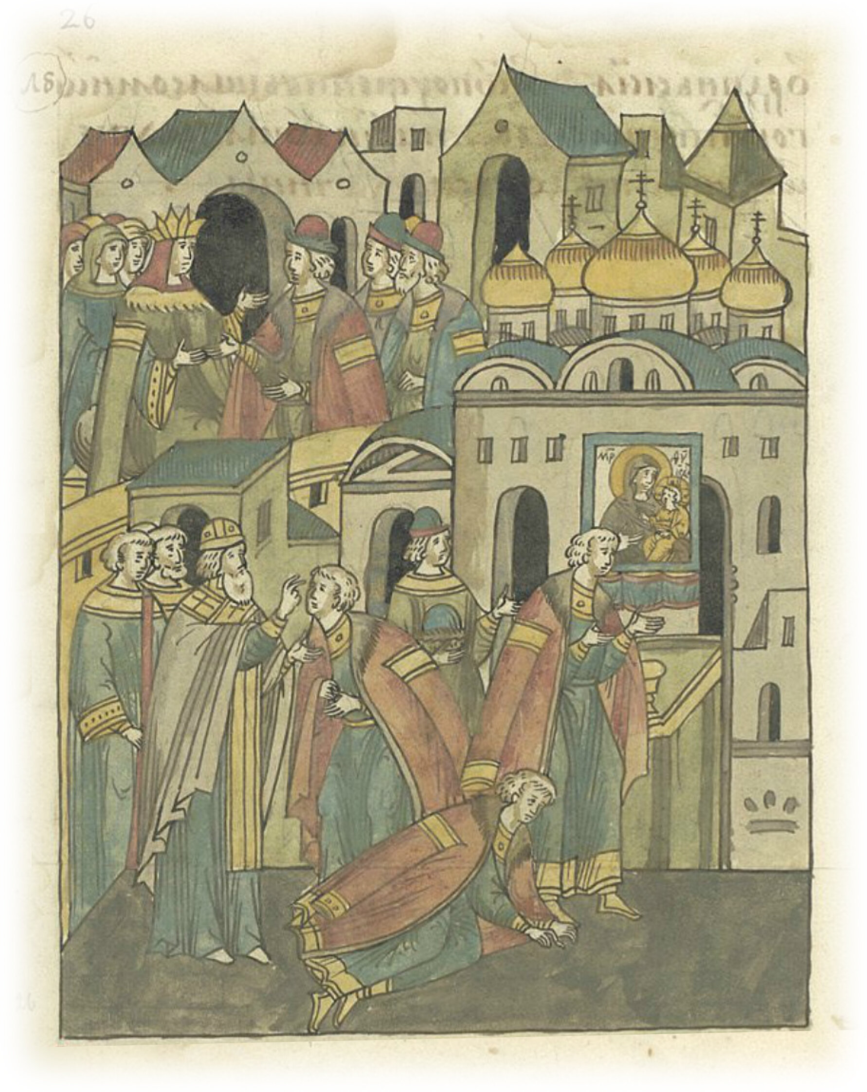 И ударил челом Пречистой Богородице, и знаменался у образа Ее, и благословился у отца своего, у Кирилла епископа, и у матери своей, у великой княгини Марии.