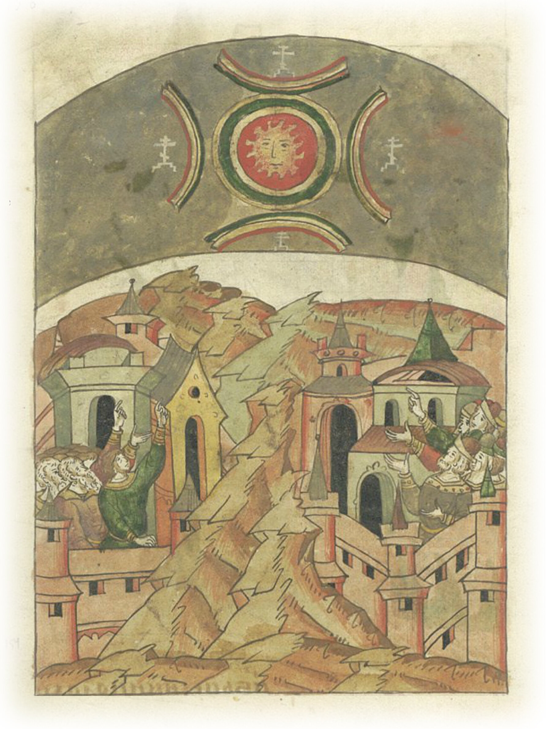 В том же году было знамение в солнце: огородилось солнце как бы кругами, а посреди кругов - кресты. Дуги же были синие, зеленые, желтые, багряные, червленые, а дуги те хребтами были друг к другу. Было же это месяца мая в 3-й день.