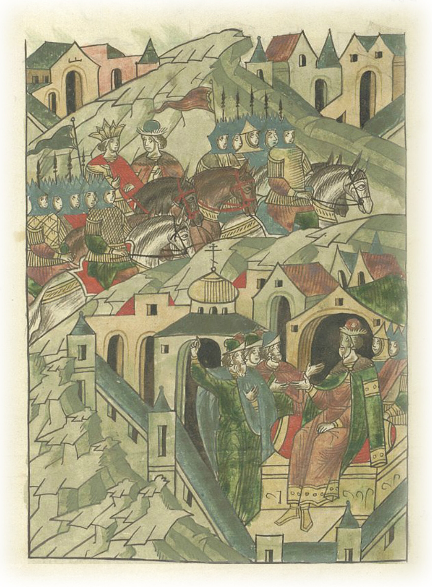 Князь Андрей Александрович приводит из Орды царевича на своего старшего брата Дмитрия Александровича.
