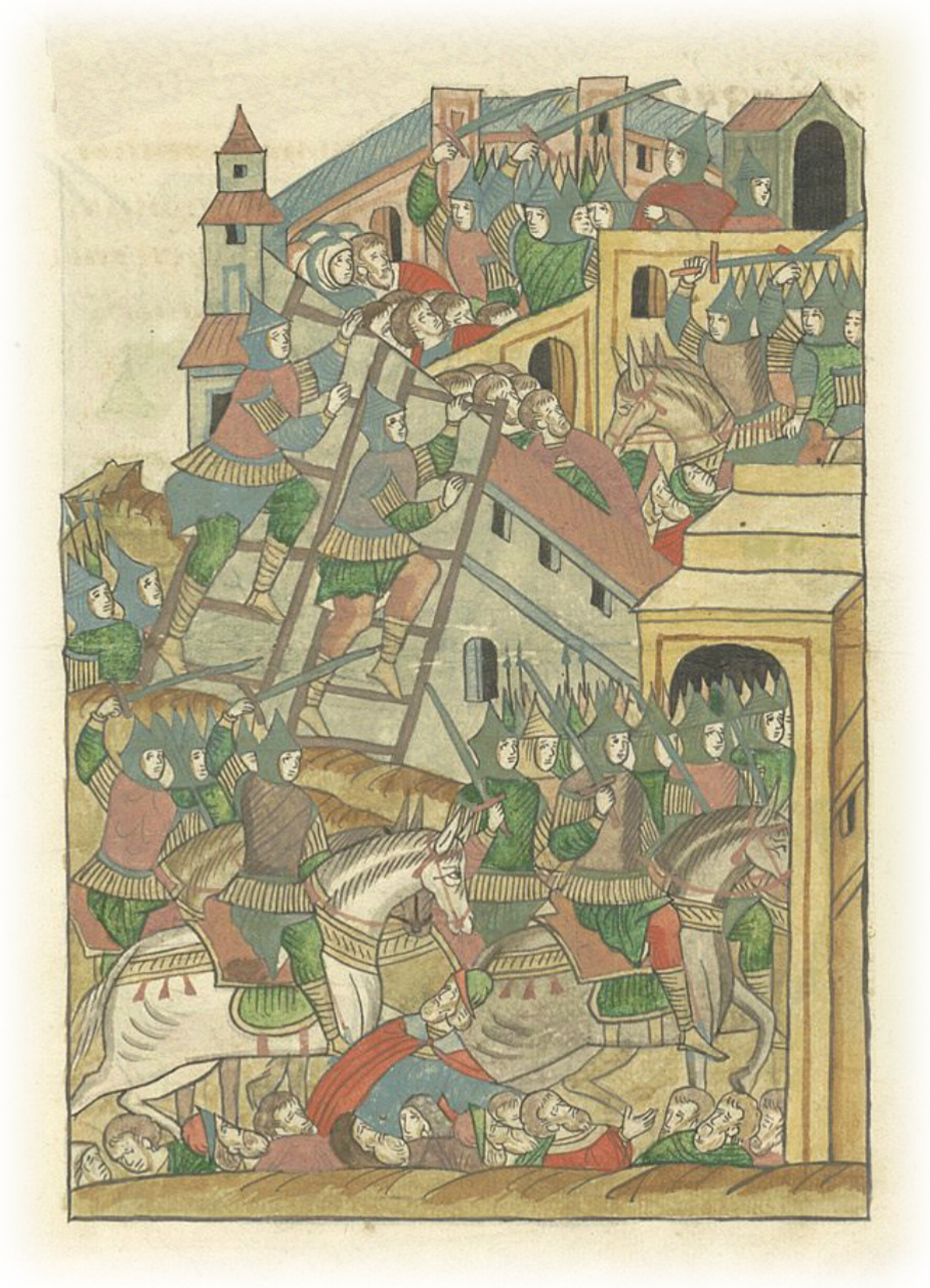 Татары же и в город пошли, секуще, а иные по лестницам на городские стены взошли, и никто не сопротивлялся им из города, забрала не имеющего, и не было ни избавляющего, ни спасающего. И была внутри города сеча великая, и вне (города) была сеча. Так много секли, что и руки и плечи их онемели, и сила их изнемогла, саблям же их острия притупились.