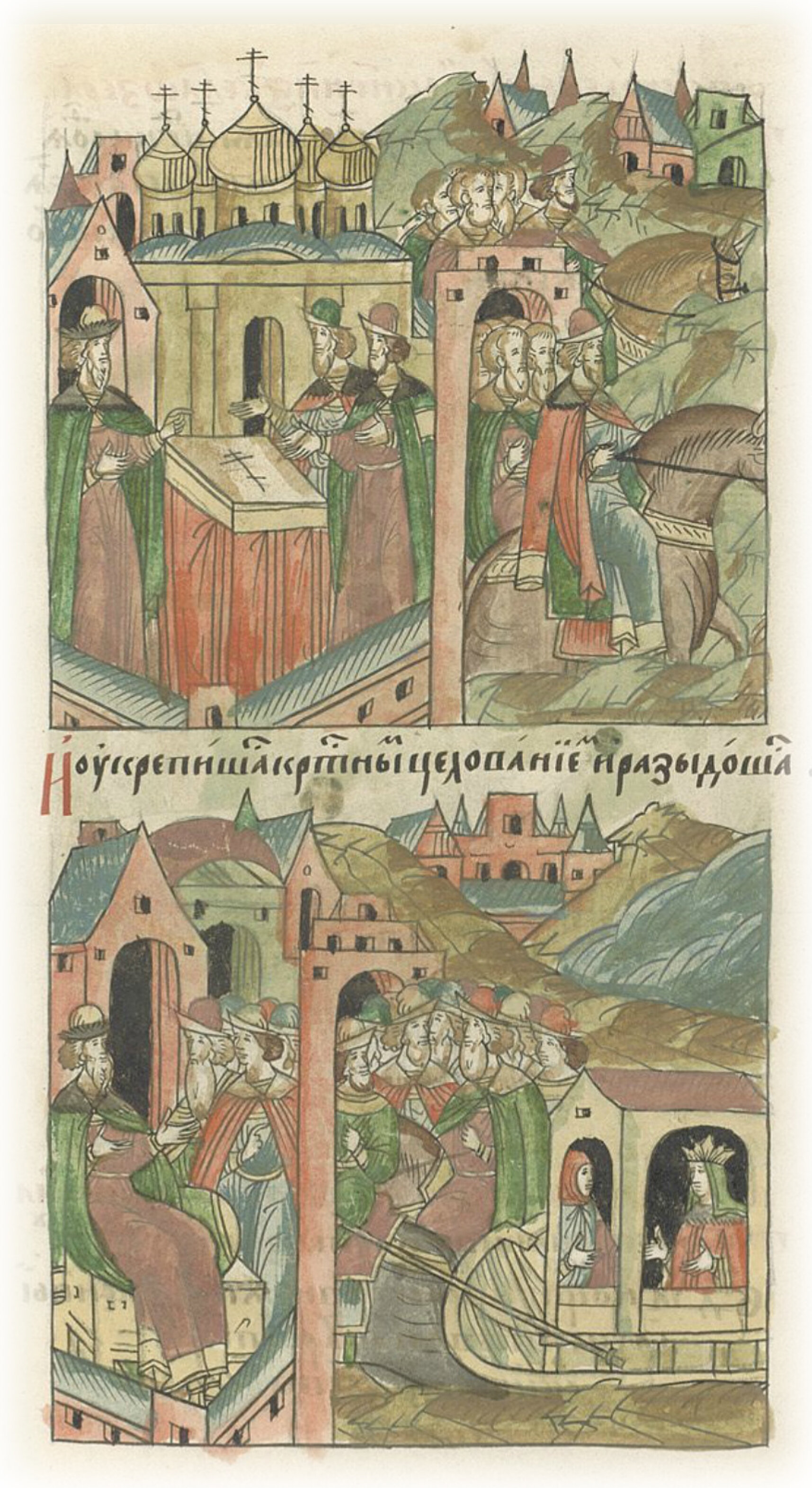 и скрепили (этот договор) крестным целованием, и разошлись. О приходе великой княгини с Белоозера. В ту же зиму пришла великая княгиня Софья с Белоозера в Москву: отсылал ее великий князь на Белоозеро из-за прихода татар.