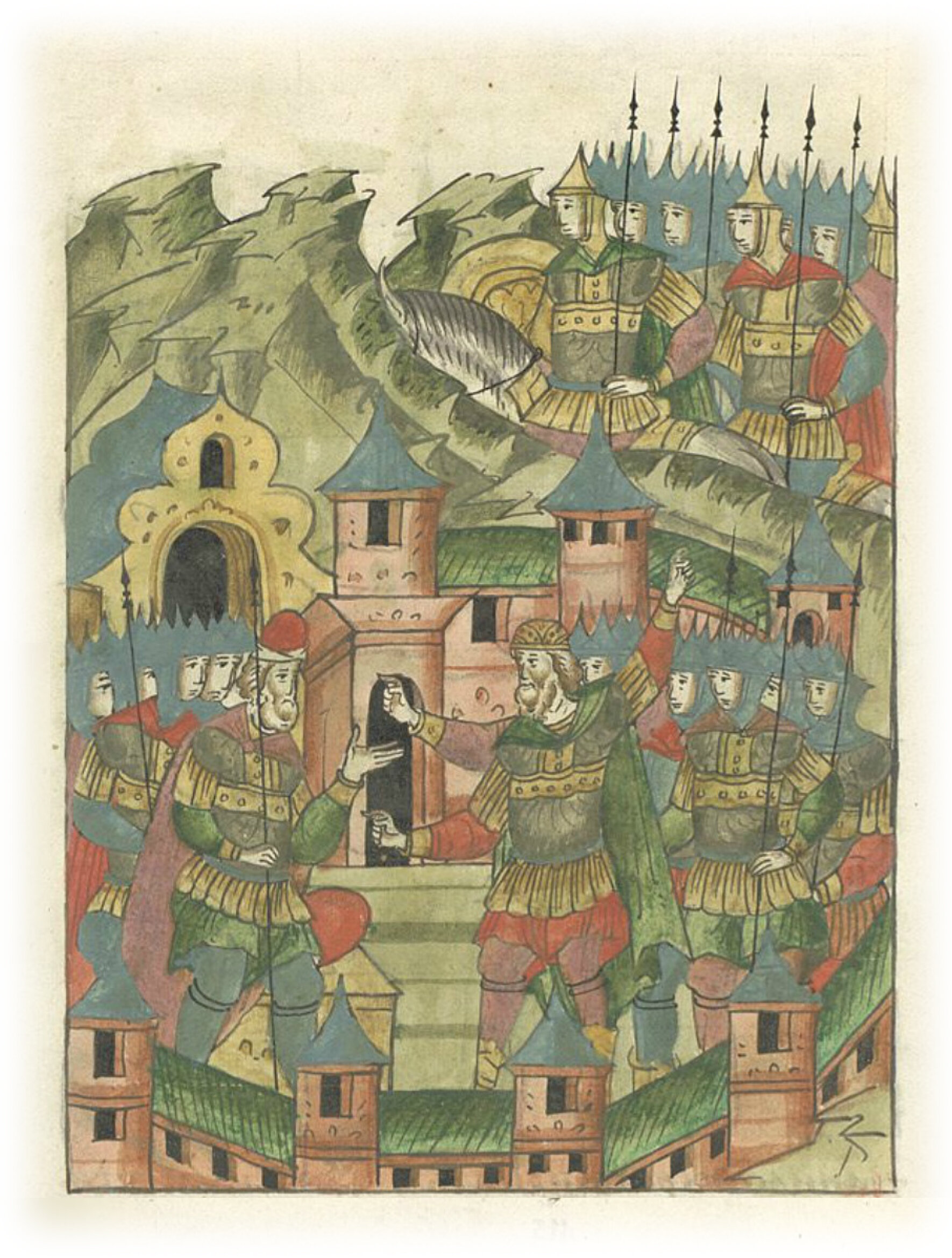 Языки говорят воеводам царя Ивана Васильевича, что магистр окопался большим рвом вокруг города Рындола, бьет из пушек и пищалей и приступает к Рындолу.