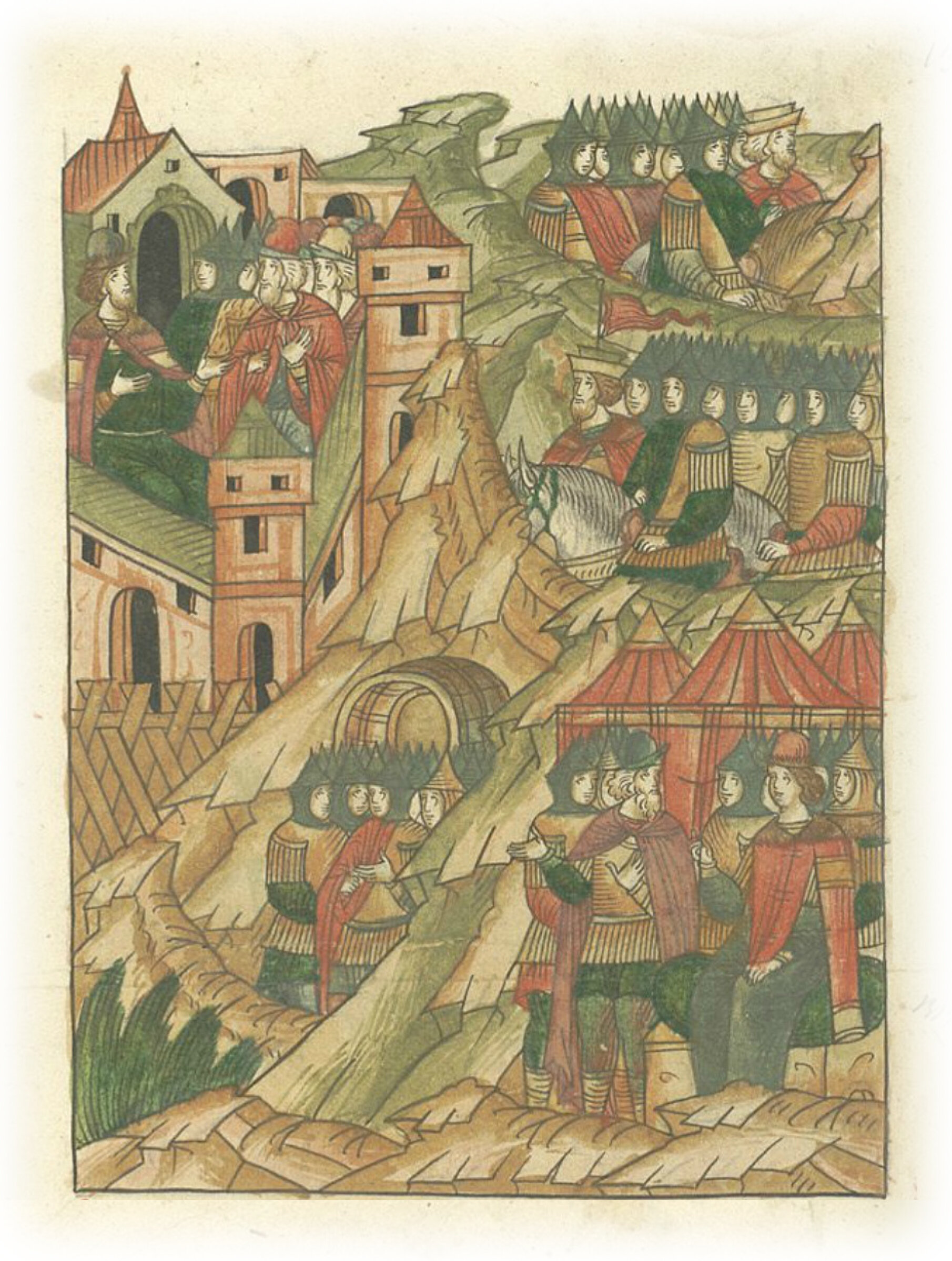 Татары и литовцы, пришедшие на помощь к князю Михаилу Александровичу Тверскому, увидев под Тверью бесчисленное войско великого князя Дмитрия Ивановича, убегают.