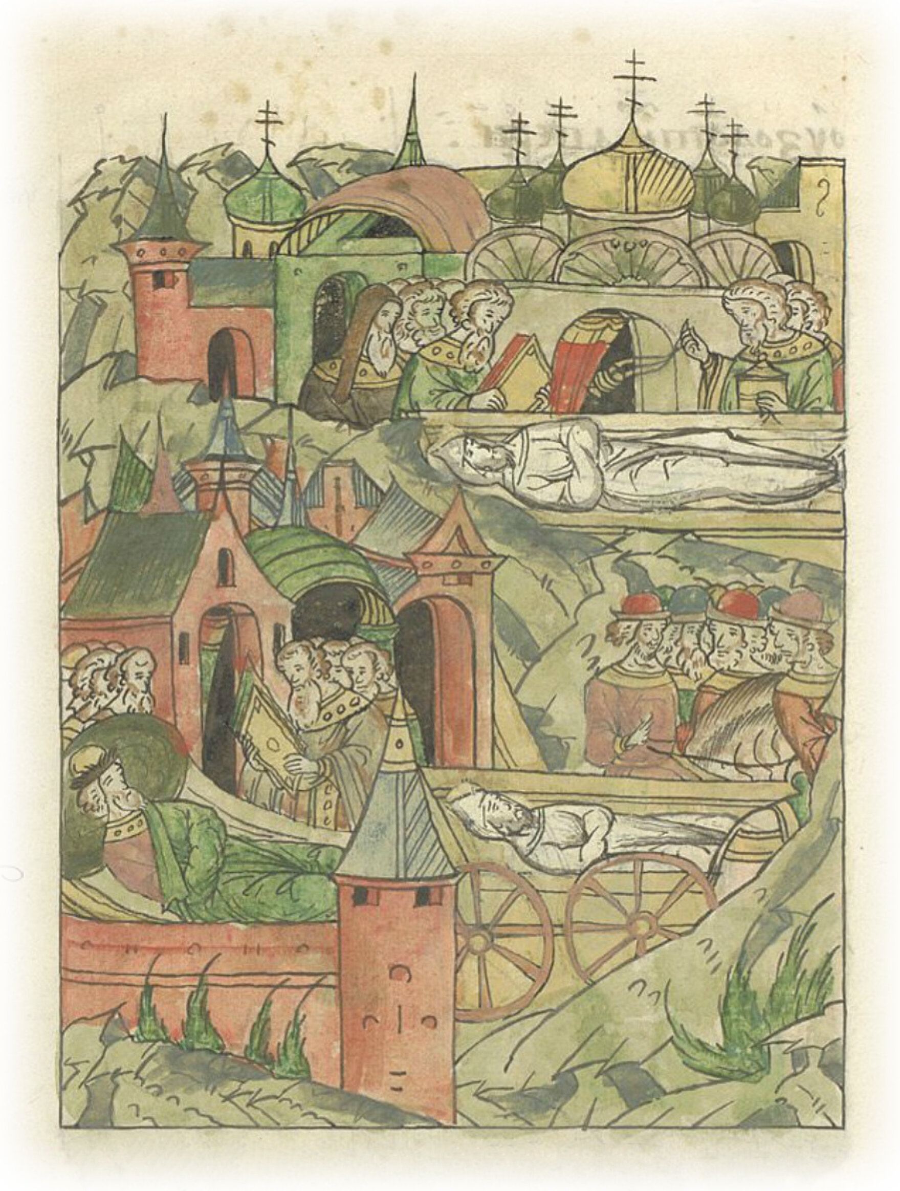 Кончина князя Андрея Дмитриевича Можайского и его похороны в церкви архангела Михаила в Москве.