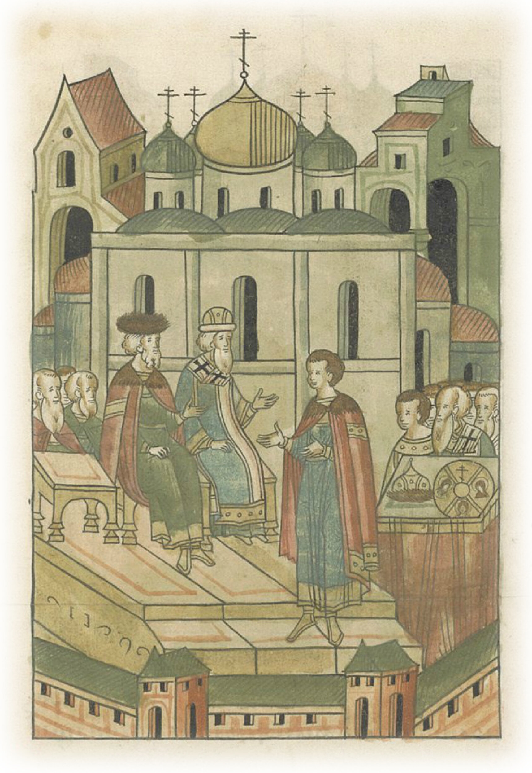 митрополит и великий князь сели на своих местах, а внук встал перед ними у помоста на верхней ступени, не поднимаясь на помост.