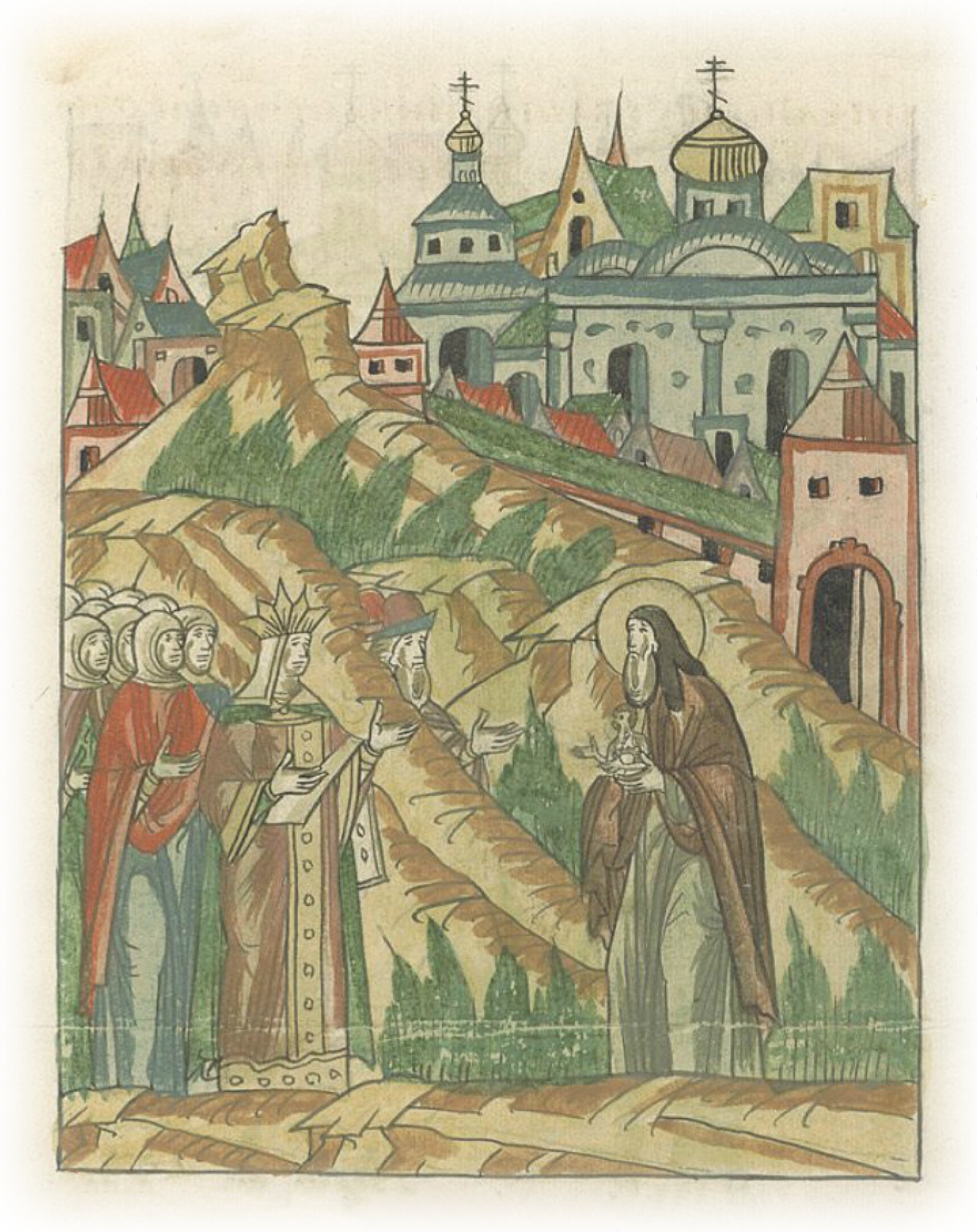 и внезапно видит своими очами идущего навстречу ей священнолепного инока, в котором она по иконе узнала преподобного чудотворца Сергия, держащего в руках малого ребенка мужского пола,