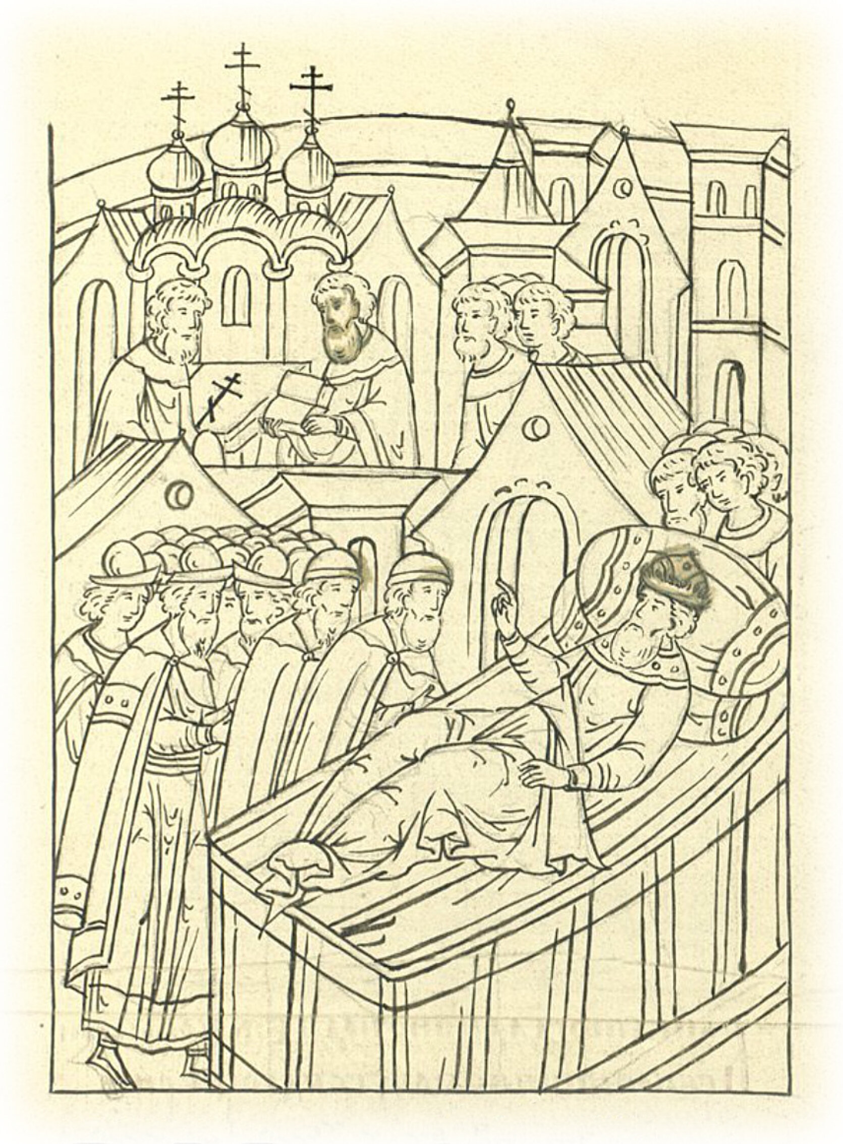И повелел отцу своему духовному Благовещенскому протопопу Алексию да Благовещенскому попу Григорию в воскресенье служить божественную литургию в церкви Рождества святой Богородицы и принести к себе святое причастие.