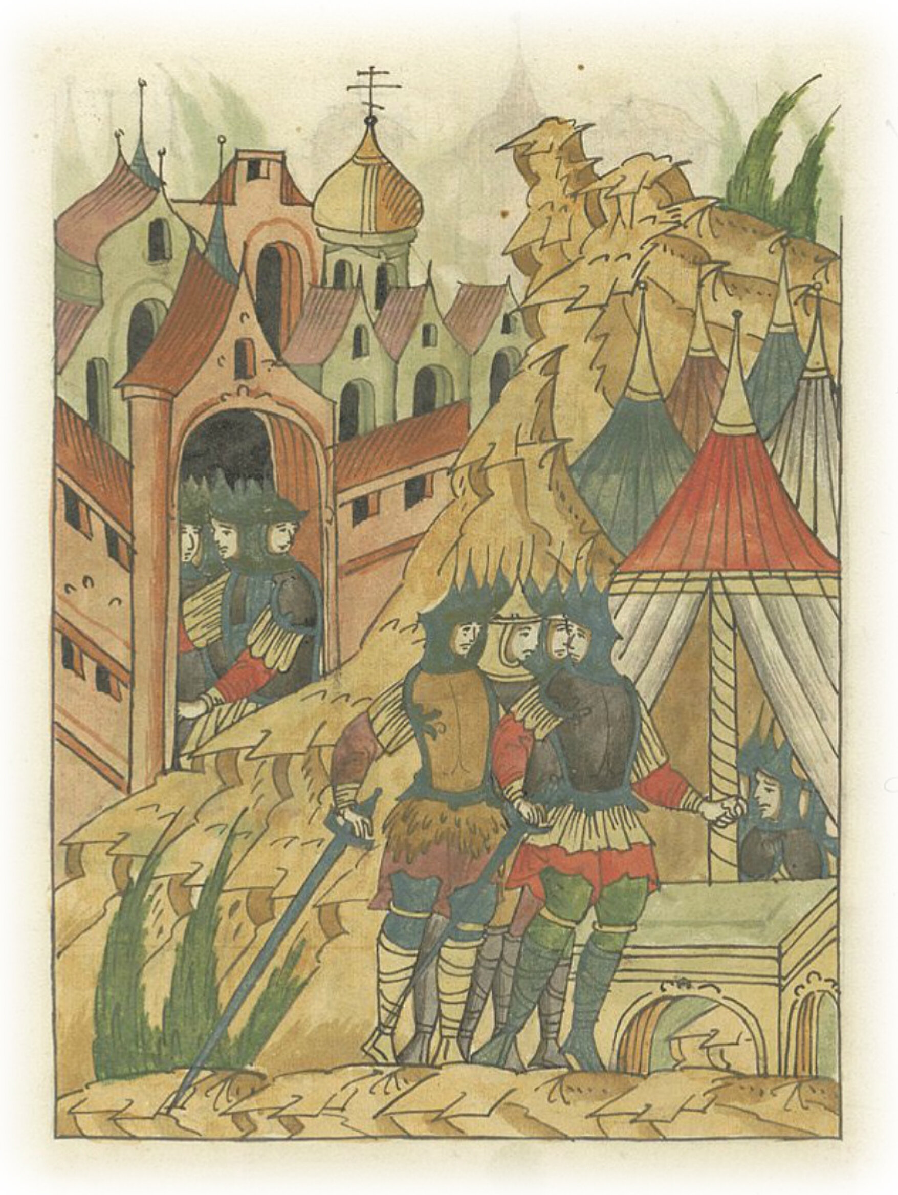 Языки говорят воеводам царя Ивана Васильевича, что магистр окопался большим рвом вокруг города Рындола, бьет из пушек и пищалей и приступает к Рындолу.