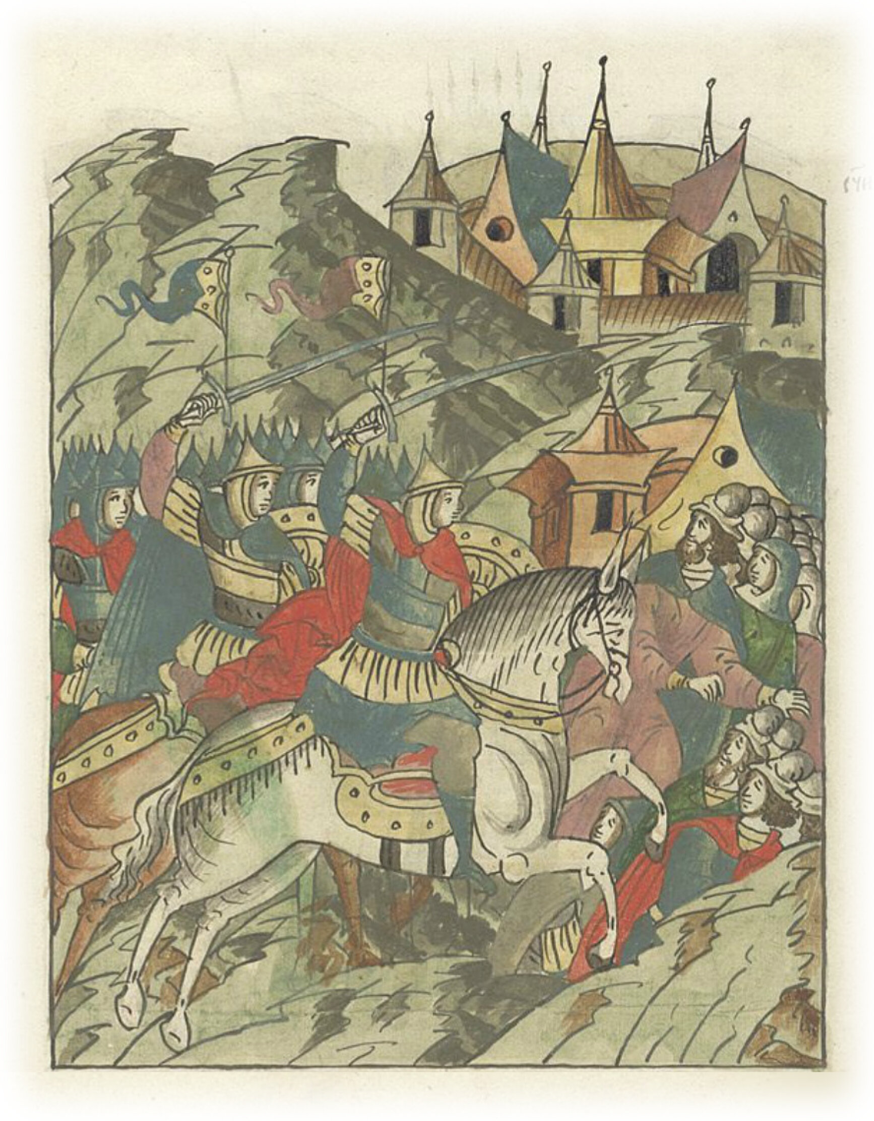 Языки говорят воеводам царя Ивана Васильевича, что магистр окопался большим рвом вокруг города Рындола, бьет из пушек и пищалей и приступает к Рындолу.