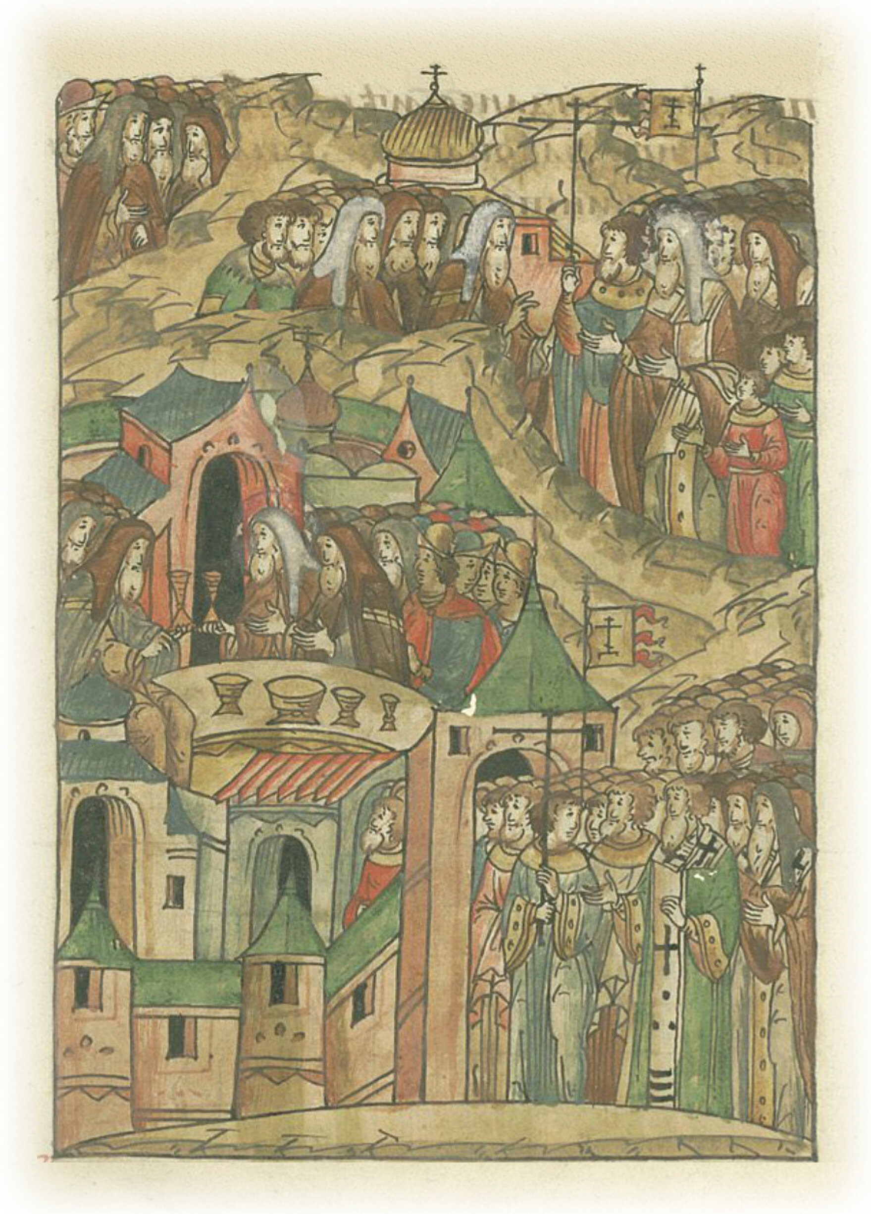И из Твери митрополит Киприан пошел в Новгород Великий. А с ним Еремей, владыка Рязанский, грек, и Даниил, владыка Звенигородский. Пришли к Новгороду, и их встречал с крестами Иван, владыка Новгородский, со всем священным собором и со всем Новгородом от мала до велика около великого Спаса в Нередице, и выделили место для постоя в (монастыре) у святого Иоанна Предтечи. И чествовал его владыка Иван с новгородцами неделю, и одарили многими дарами.