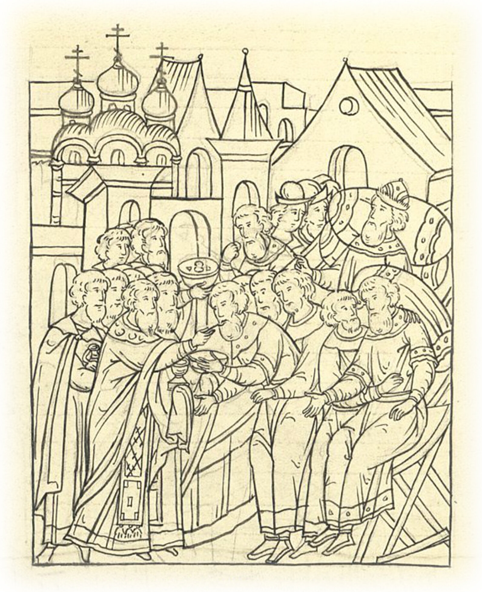 Было же тогда дивное чудо, которое сотворил Господь по истинному его благоверию: до того прежде не мог великий князь повернуться со стороны, на которой лежал, но поворачивали его; и повелел себе сказать, когда дары понесут, а для себя повелел принести кресла к постели. И когда же принесено было к нему святое причастие, то встал сам, немного же его приподнял Михайло Юрьевич; и сидел князь великий в кресле, и принес к нему протопоп Алексей святые дары, а поп Григорий дору; и тогда встал сам на ноги свои, и со многим благоговением и со слезами причастился честнó Пречистого тела и крови Христа Бога нашего, дору же и хлеба Пречистой Богородицы немного взял, и укропу же, и кутьи, и от просфиры мало вкусил.