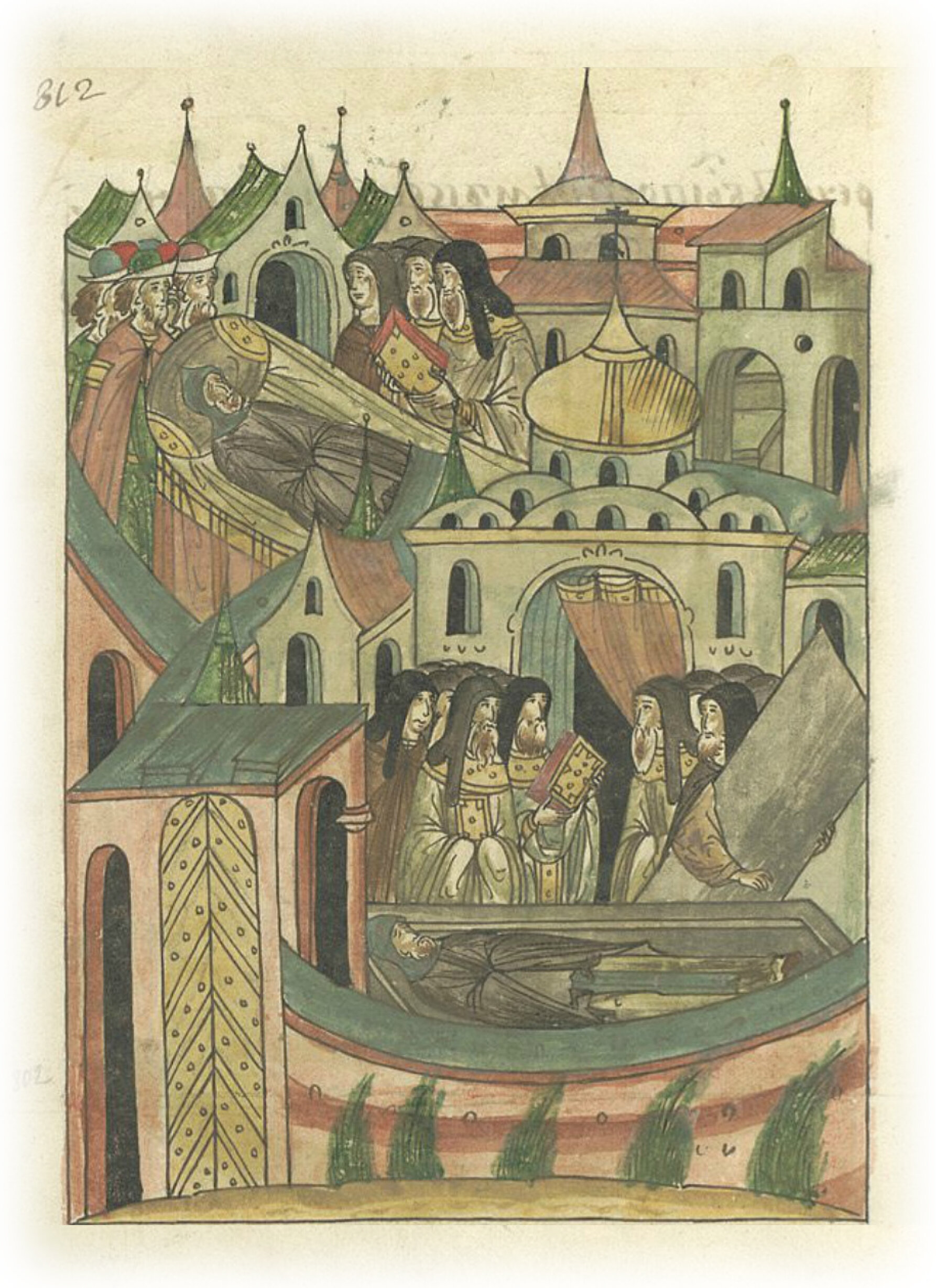 Кончина князя Василия Муромского и его похороны в церкви святых мучеников Бориса и Глеба, в монастыре на Ушне.