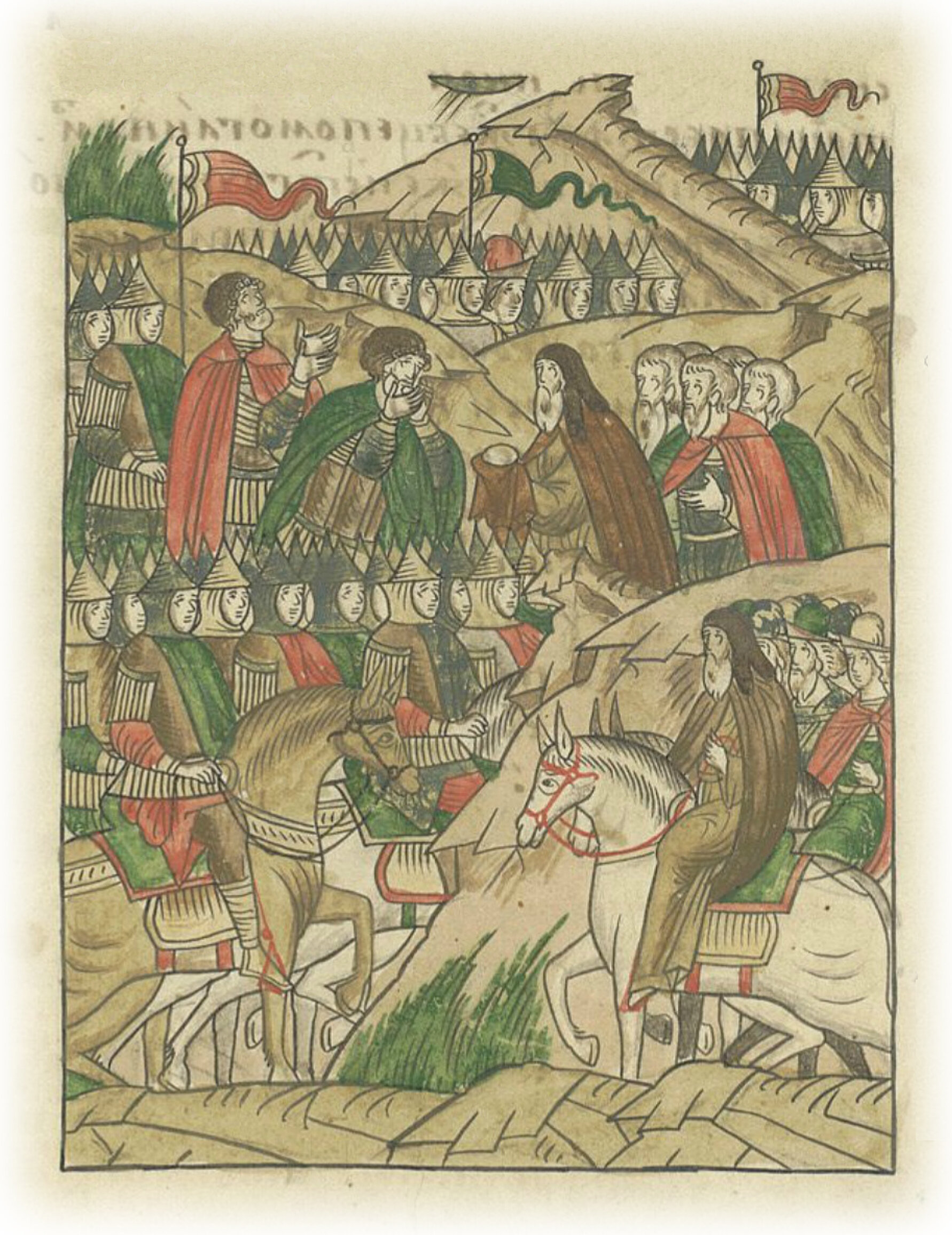 Посланники от игумена Сергия Радонежского передают великому князю письмо с благословением и хлебец Пречистой Богородицы.