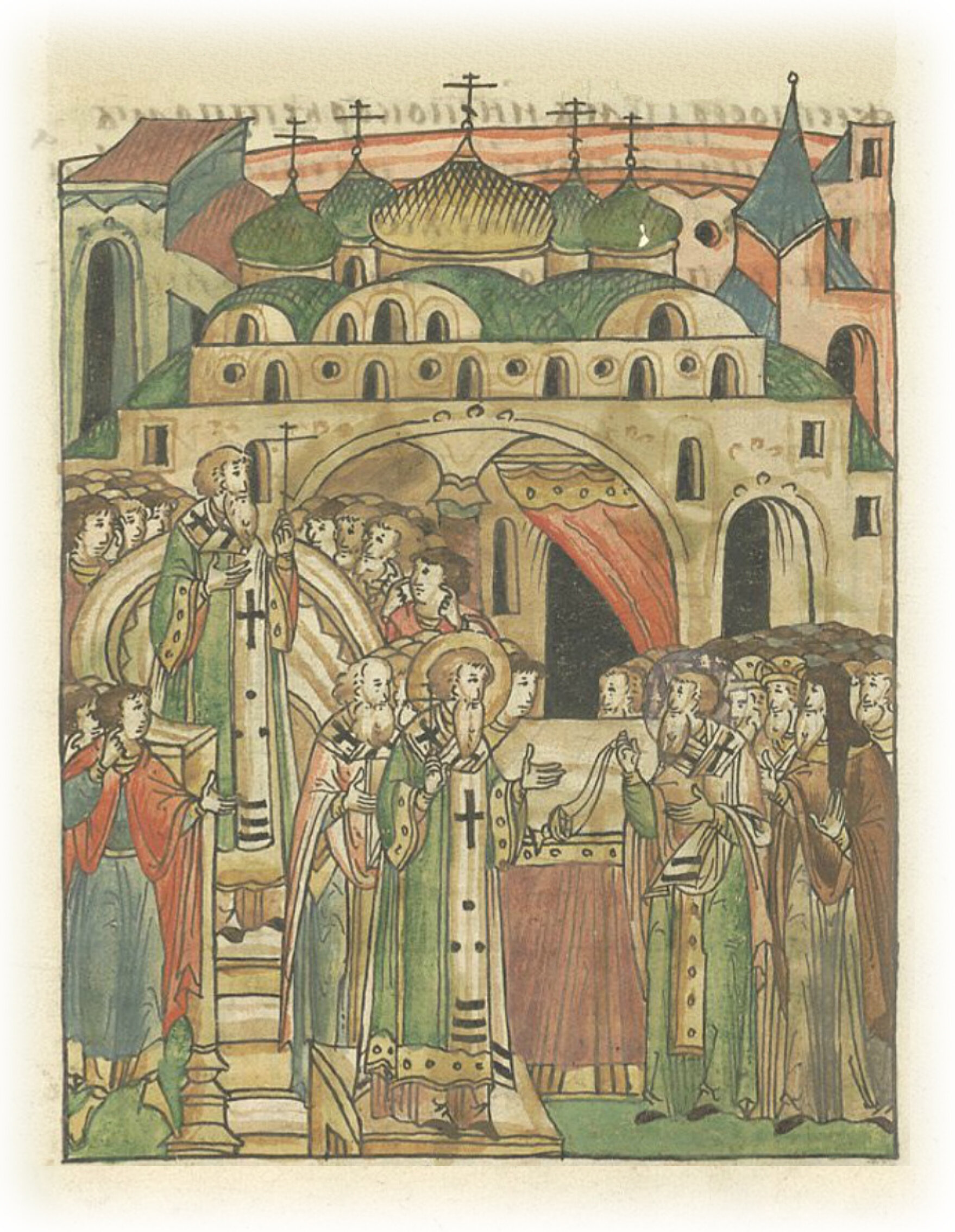 Митрополит всея Руси Киприан служит литургию в святой Софии в Новгороде, но новгородцы не принимают его поучений и отказываются получить благословение.