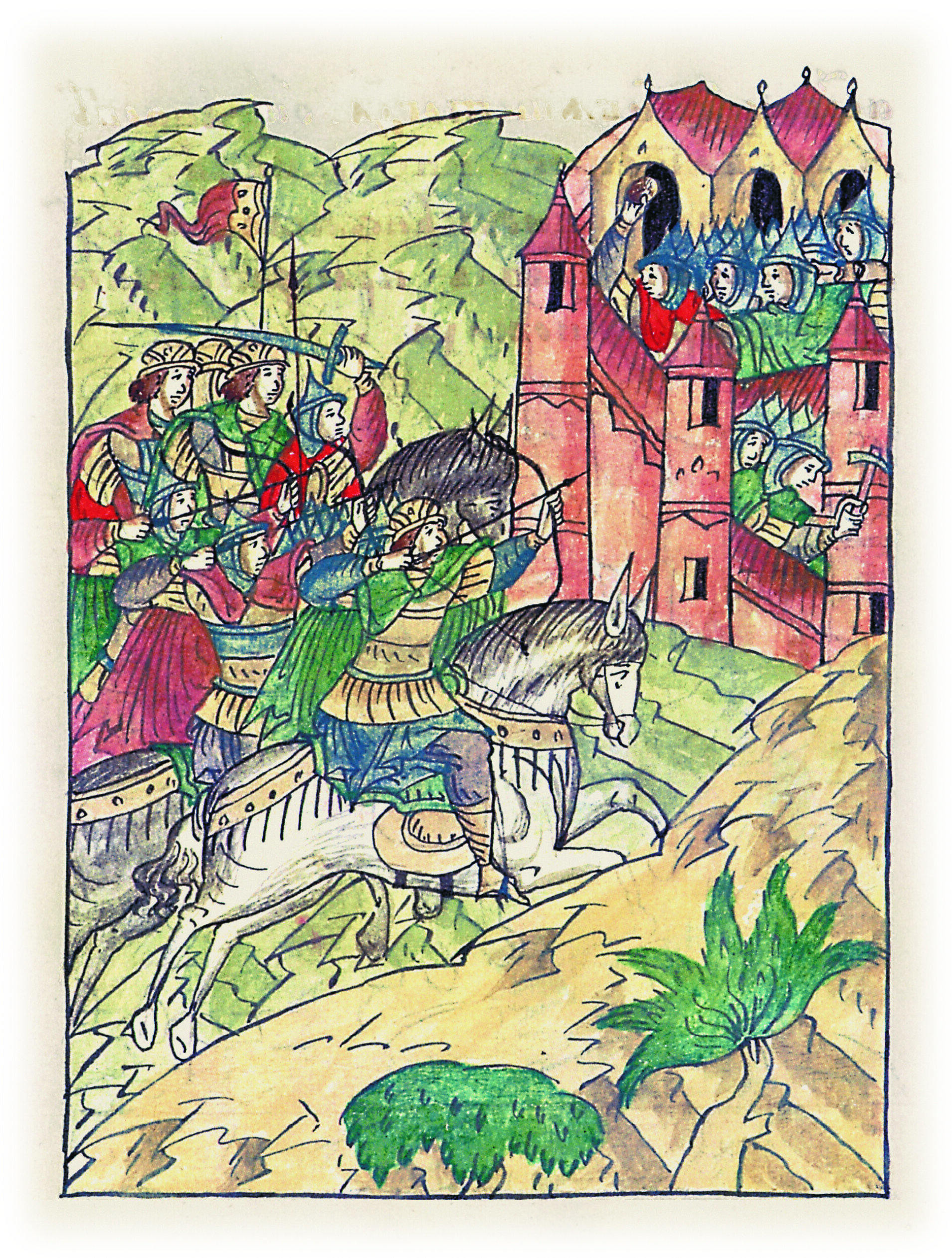 И пришли к городу. Новгородцы же поставили острог около всего Новгорода; и приступили суздальцы со всеми князьями, и бои многие были, горожане же крепко бились из города.