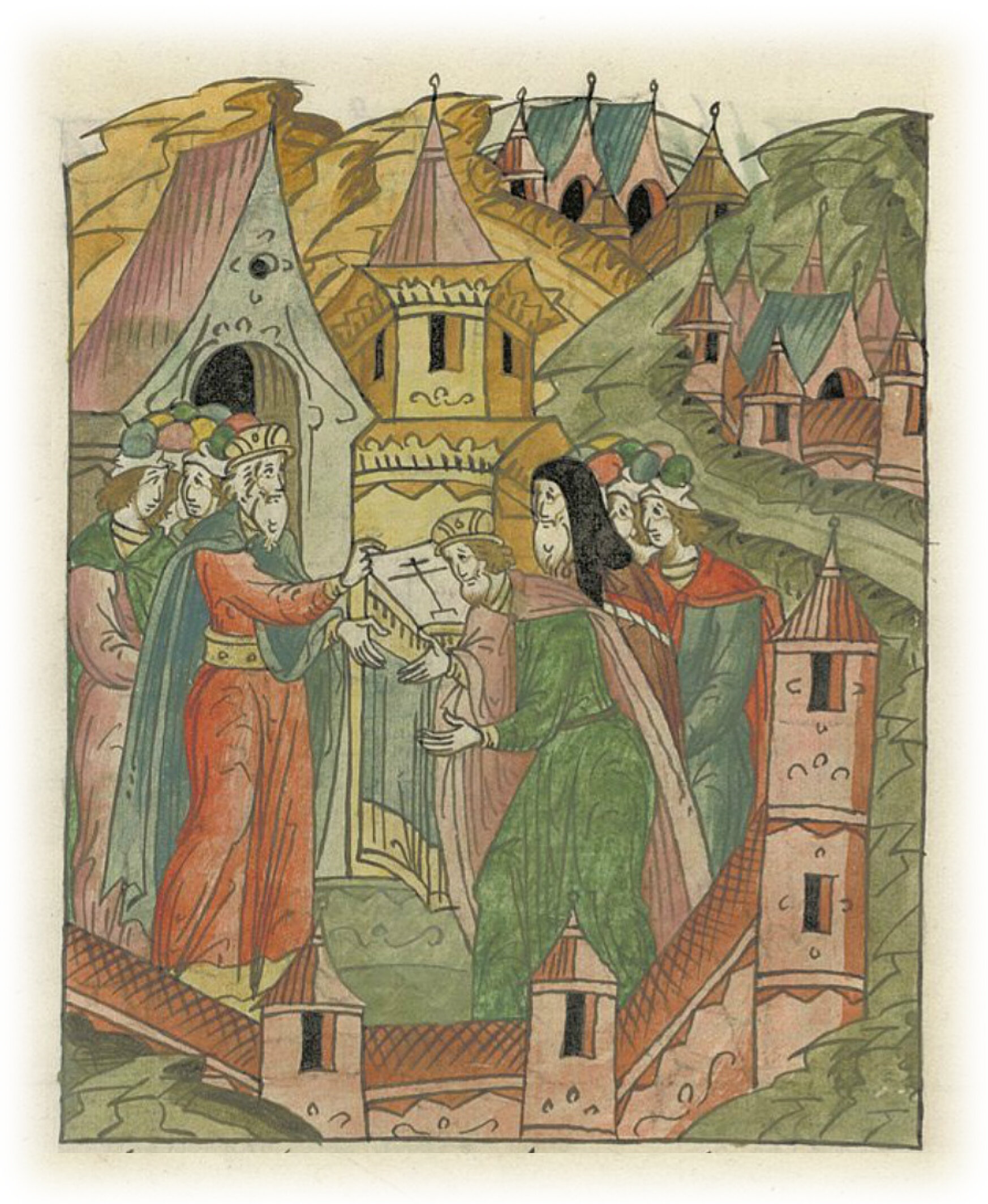 Ругодивские посадники Яким и Захар приезжают в Москву. Воеводы царя Ивана Васильевича Алексей Адашев и Иван Михайлов сообщают им, что государь пожалует их, если сдадут его воеводам помимо Ругодива Вышгород.