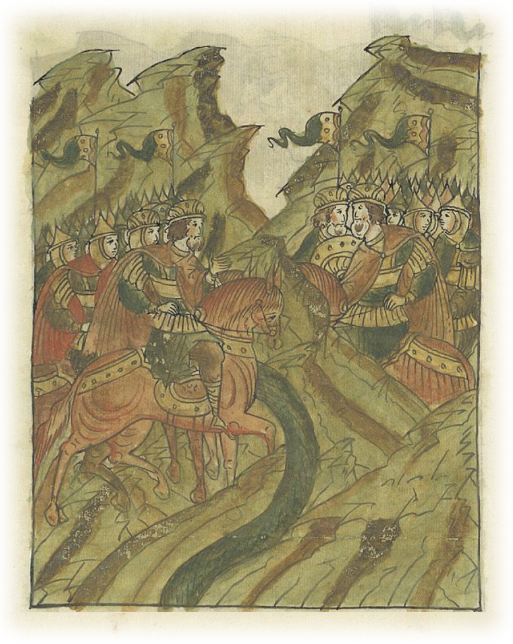И встали сыновья Всеволода с воинством своим на горе Авдовой. Князь же Ростовский Константин Всеволодович, князь Новгородский Мстислав Мстиславич, князь Смоленский Владимир и князь Всеволод Мстиславич Романовича со своими полками встали против них на другой горе, которая называется Юрьева гора. А посреди гор был ручей, называвшийся Туген.