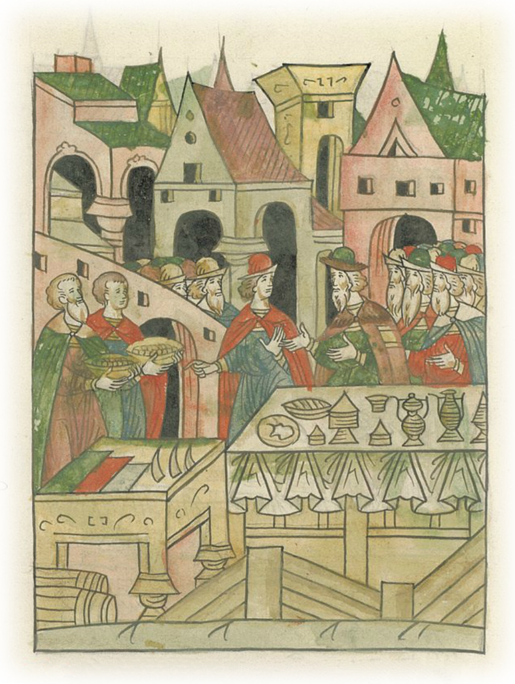 Января (месяца) в 1 день пир в честь великого князя у Якова Федорова; даров: 40 кораблеников золотых, три постава фландрского сукна, три клыка моржа, а от внука его, от Ивана Дмитриева, сына Исакова, двадцать кораблеников золотых да две бочки вина.