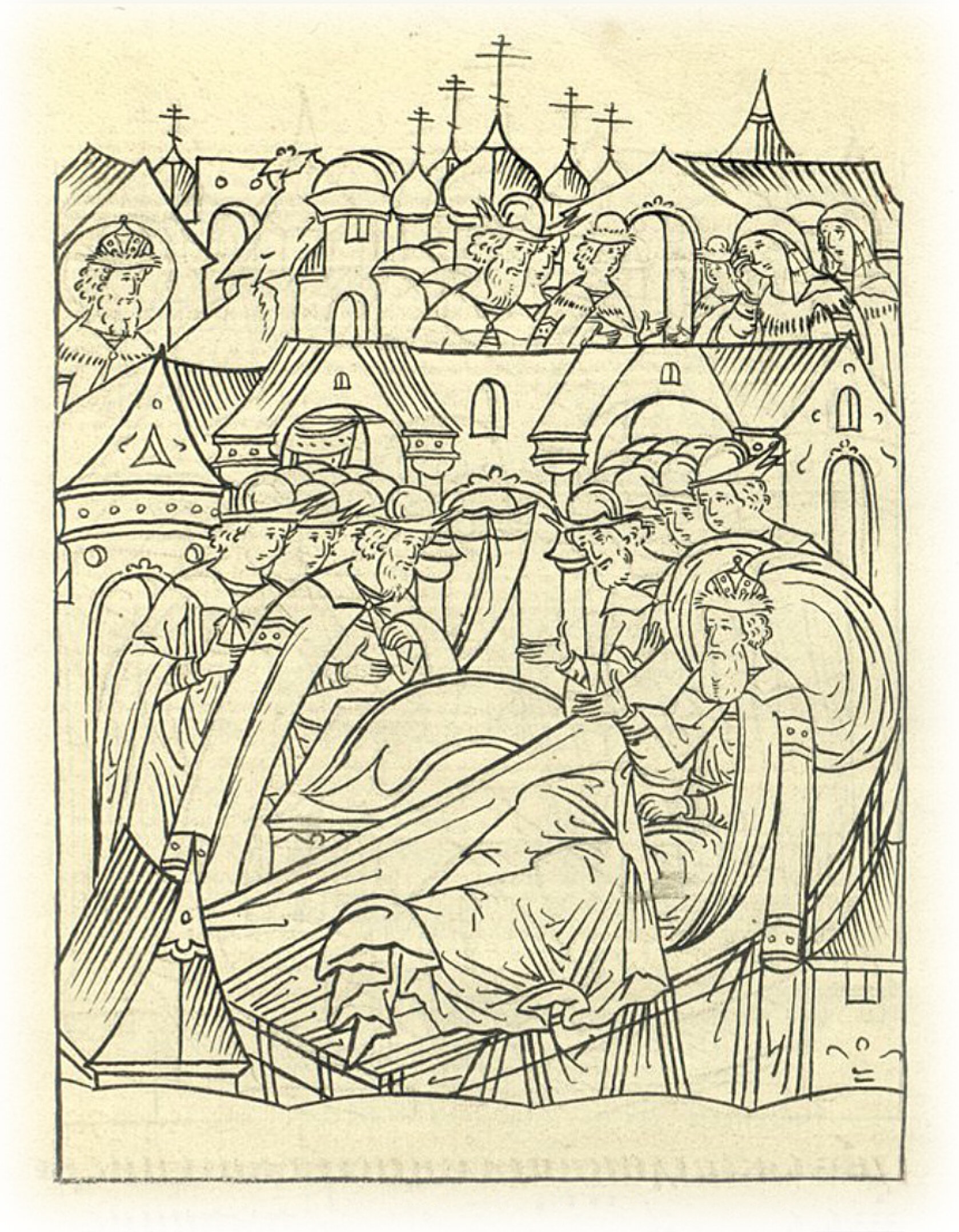 И начал говорить своим боярам: «Знаете и сами, что от великого князя Киевского Владимира ведется наше государство Владимирское и Новгородское и Московское; мы вам государи прирожденные, а вы наши извечные бояре; и вы, братья, стойте крепко, чтобы мой сын учинился на государстве государем, и чтобы была в земле правда».