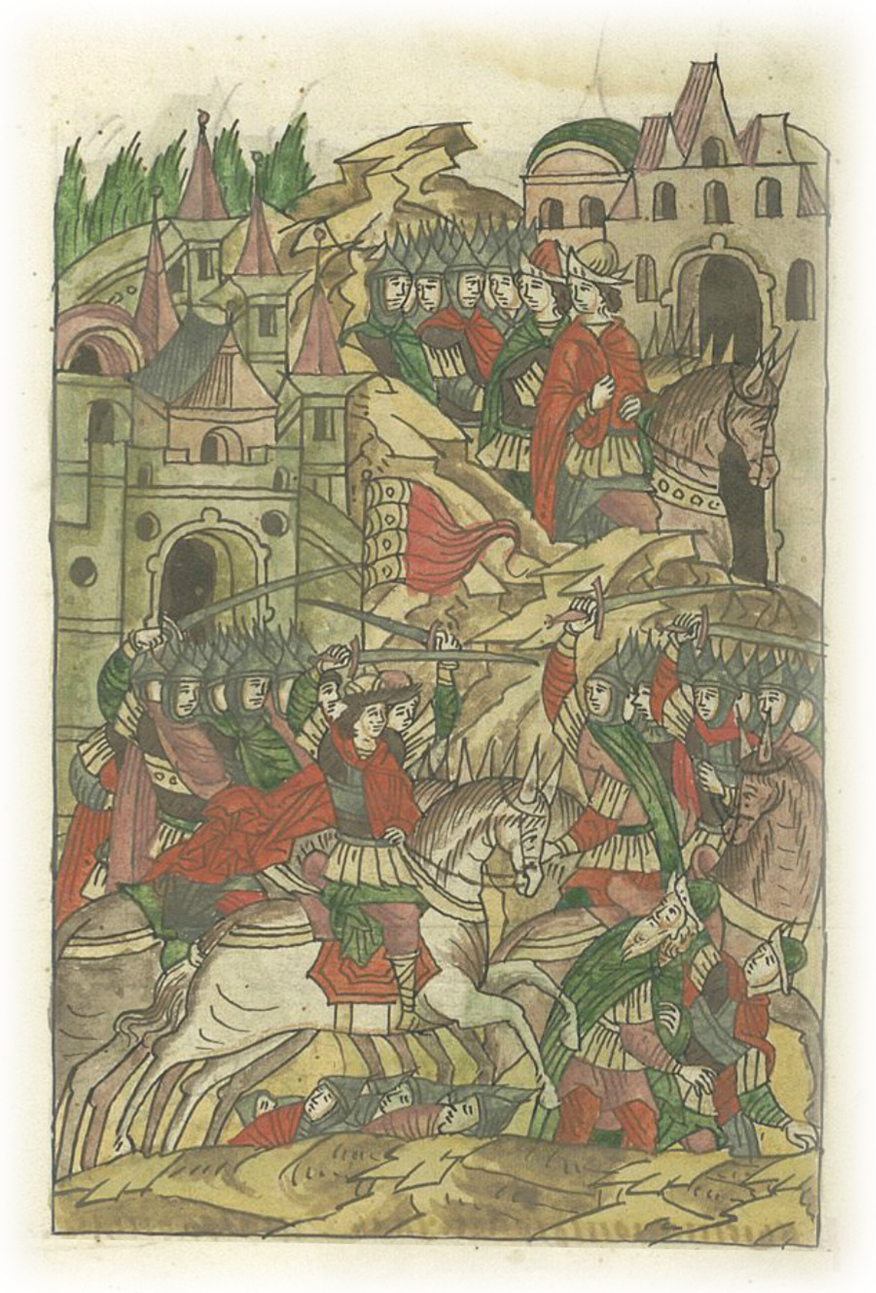И бились очень крепко. И помог Бог великому князю Ивану Даниловичу, и убит был тут под Переславлем Акинф и зять его Давыд; много тверичей избито было там. А дети Акинфовы, Иван да Федор, еле убежали в Тверь.
