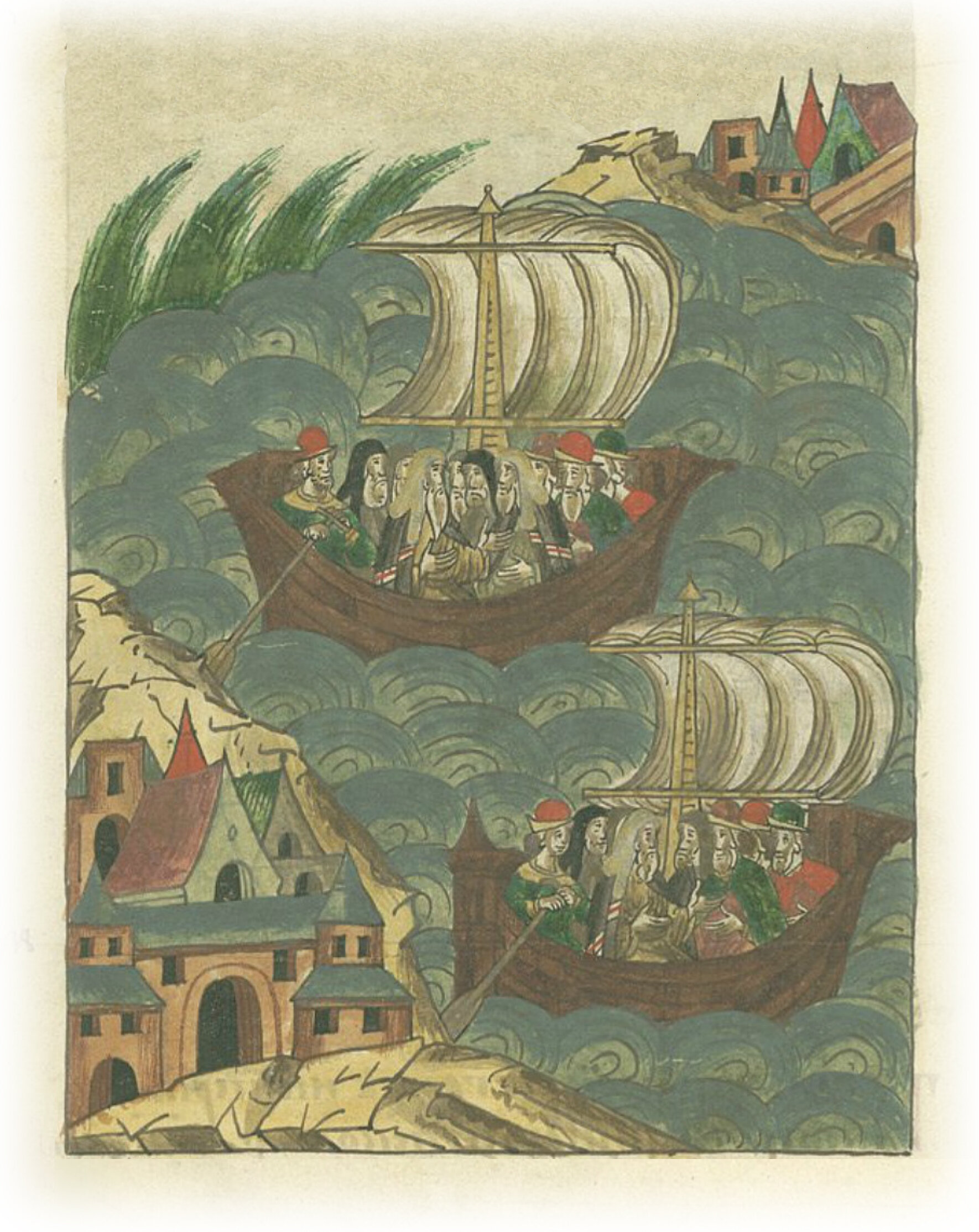 Поставленный патриархом Антонием на Киев и всю Русь митрополит Киприан идет из Царьграда со Смоленским епископом Михаилом, Валыдским владыкой Ионой, Симоновским архимандритом Феодором и двумя греческими митрополитами.