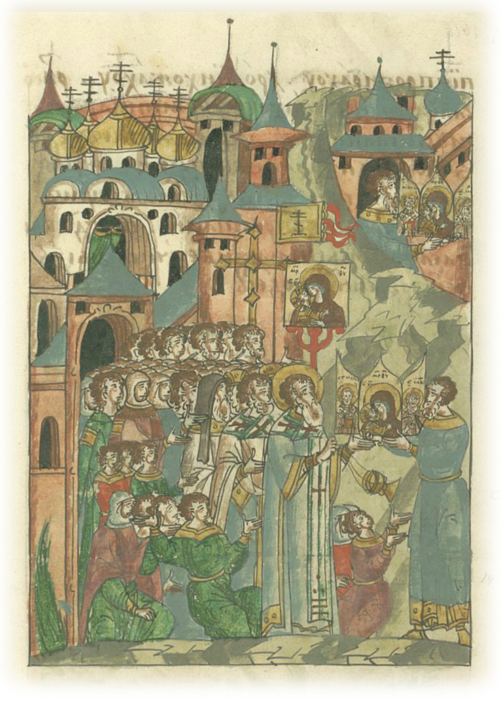 Потом оттуда Лука отправился с иконой в Москву, там ее встретили с крестами митрополит с епископами и со всем священным собором. Также и князья, и княгини со своими детьми, бояре и воеводы, все вельможи и все православное христианское множество вышло встречать икону. И много происходило чудес: слепые прозревали, хромые начинали ходить, расслабленные вставали, немые обретали речь, глухие – слух, страдающие любой болезнью выздоравливали, что много говорить, не может человеческий ум постигнуть бесчисленное множество произошедших там чудес.