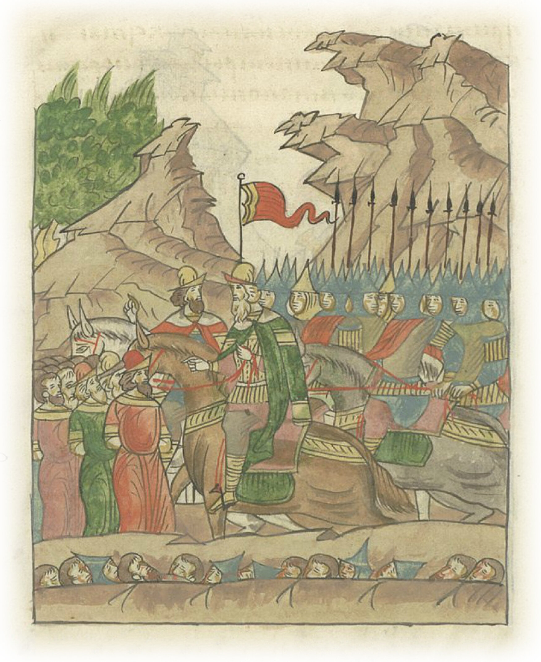 И начали говорить воеводы пойманным ими новогородцам: «Чего ради вы с таким множеством воинов своих так мало продержались, видя малое наше воинство?» Они же сказали воеводам: «Потому что мы видели вас бесчисленное множество, идущее не только навстречу нам, но и еще в тылу у нас видели иные полки, пришедшие с желтыми знаменами и большими стягами, и (слышали) многий говор людской и страшный конский топот. И такой ужас напал на нас, и страх объял нас, и трепет вошел в сердца наши». Было же это месяца июня 14, в день воскресный, рано утром, на память святого апостола Акилы.