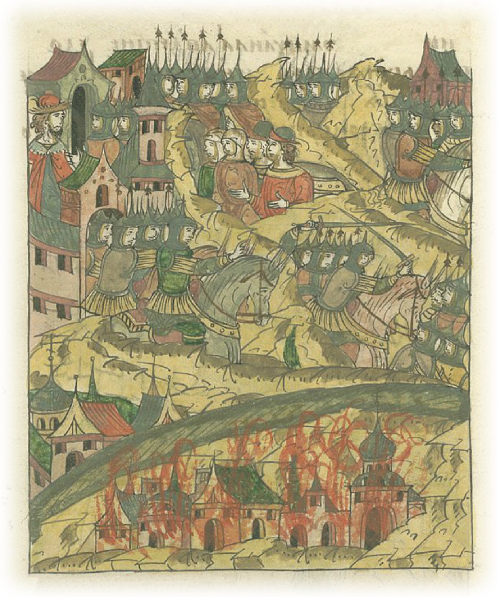 Воины князя Феодора Олеговича догоняют напавших на Рязань татар и побеждают их. Пожар за рекой Тмакой в Твери.