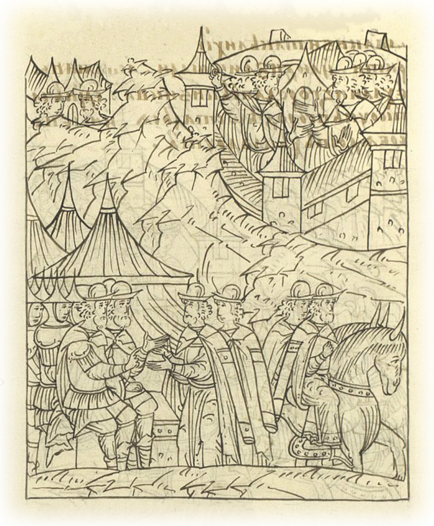 И бояре послали в город Кудагула-улана и Бурнаша-князя (и спрашивают): «Почему вы изменили? Вчера и сегодня клялись, а ныне изменили; мы же на чем присягали, на том и ныне плохого им ничего не делаем». А на посаде в ту пору люди живут со всем имуществом, и бояре, не желая погрешить против крестного целования, ни одному человеку плохо не сделали.