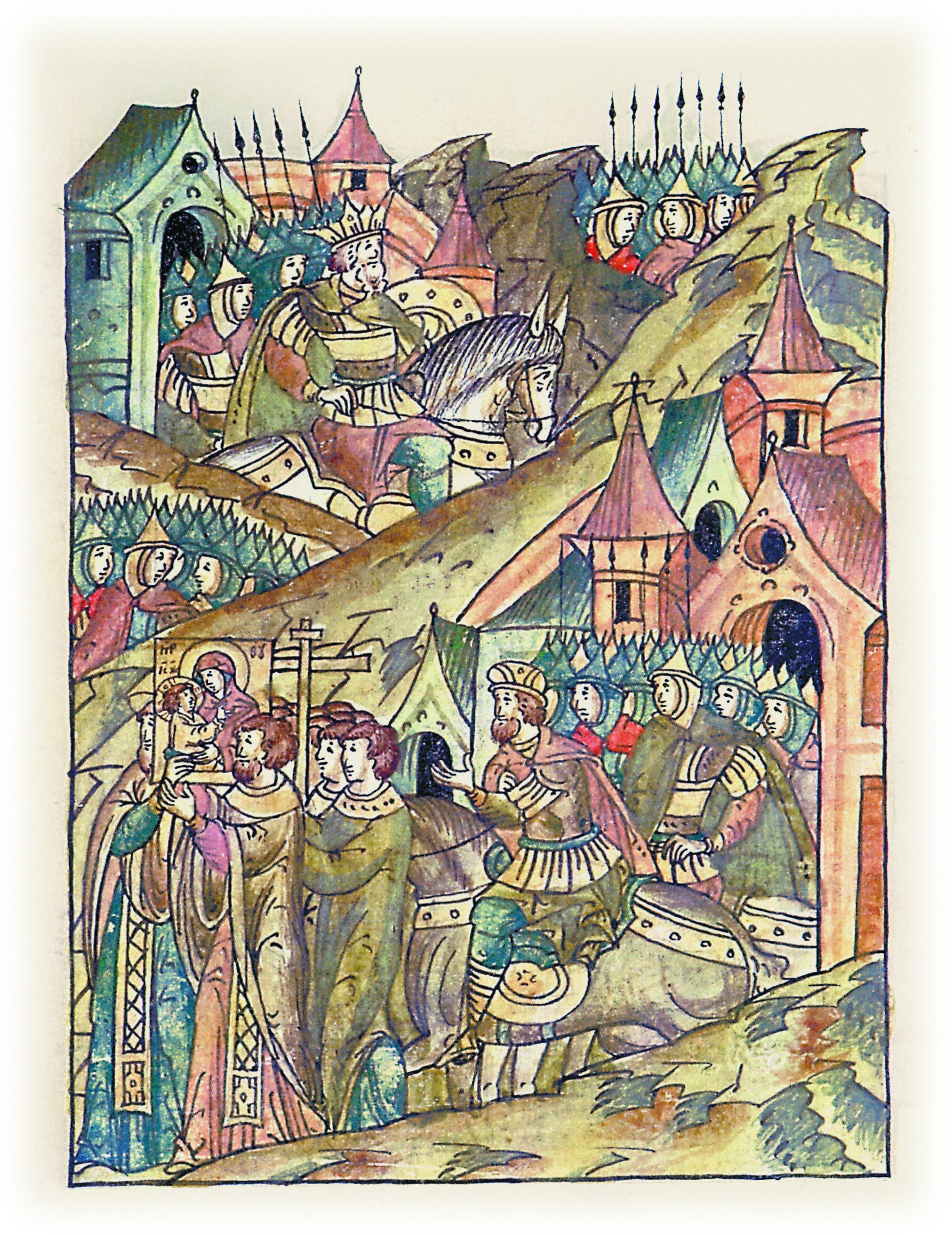 Сии оба самодержца между собой в любви многой жили, и случилось им обоим выйти в один день на брань: Царьградскому – из Царьграда на персов, Ростовскому же из Ростова на болгар, которые называются казанцами. Обычай же имел князь Андрей Боголюбский, сын Юрия Долгорукого, идя на брань, (чтобы) икону пречистой Богородицы и Животворящий Крест Христов два пресвитера во священных ризах носили (перед ним); он же со слезами, с чистою душей и сердцем сокрушенным припадал пред образом Божьей Матери и Честного Креста, говоря так: «Пресвятая Госпожа Владычица Богородица, родившая Христа Бога нашего, стена и помощь, и надежда всем! И я, грешный и недостойный раб Твой, считаю Тебя стеной и помощью, и покровом, и Крест Сына Твоего – оружие непобедимое на врагов»; и еще так говорил: «Владыко Господи Исусе Христе, Боже наш, молитвами Пречистой Твоей Матери и силою Честного Твоего Креста, помоги нам на безбожных сих варваров, да прославится пресвятое имя Твое и пречистой твоей Матери».