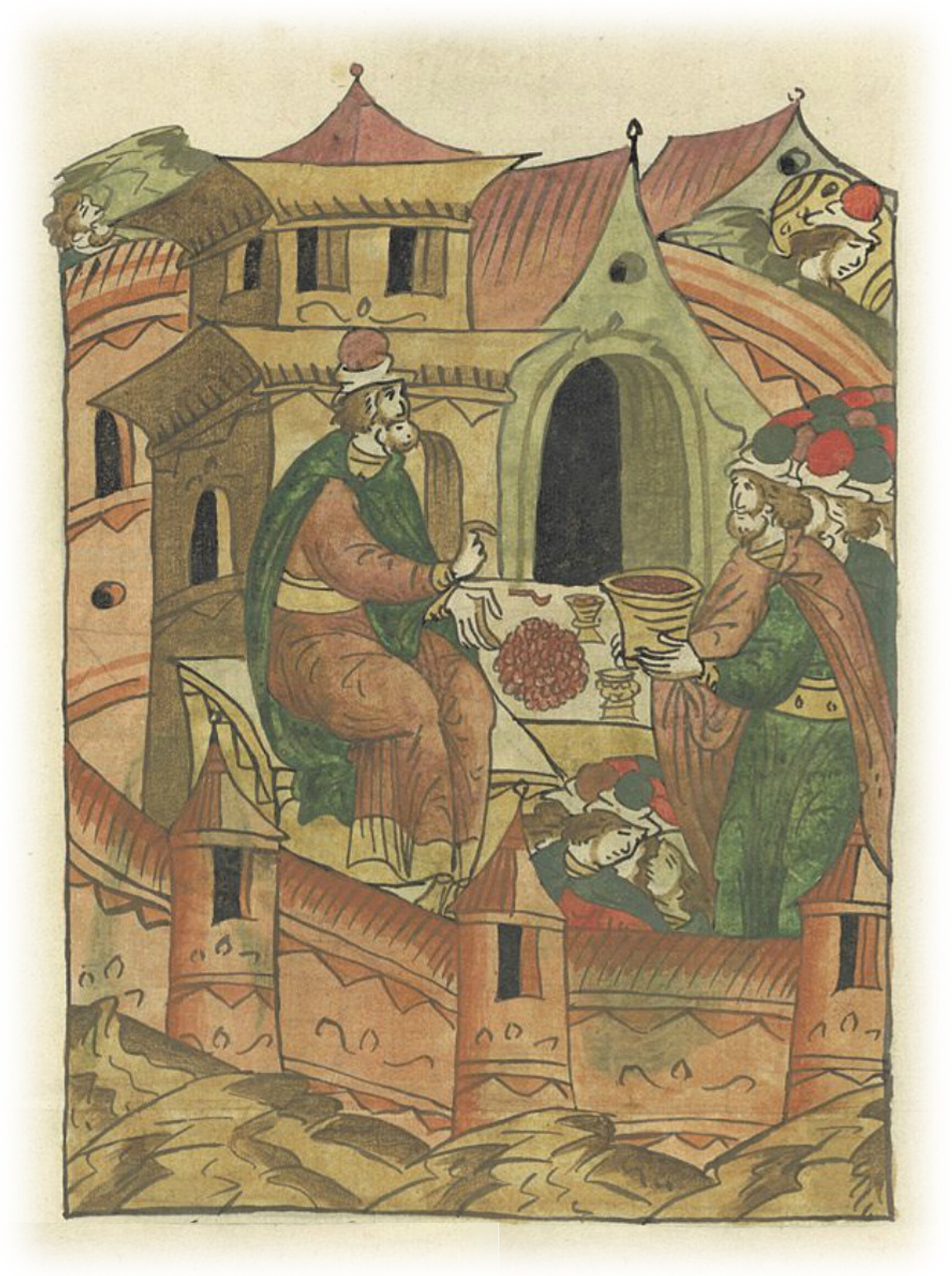 Ругодивские посадники Яким и Захар приезжают в Москву. Воеводы царя Ивана Васильевича Алексей Адашев и Иван Михайлов сообщают им, что государь пожалует их, если сдадут его воеводам помимо Ругодива Вышгород.