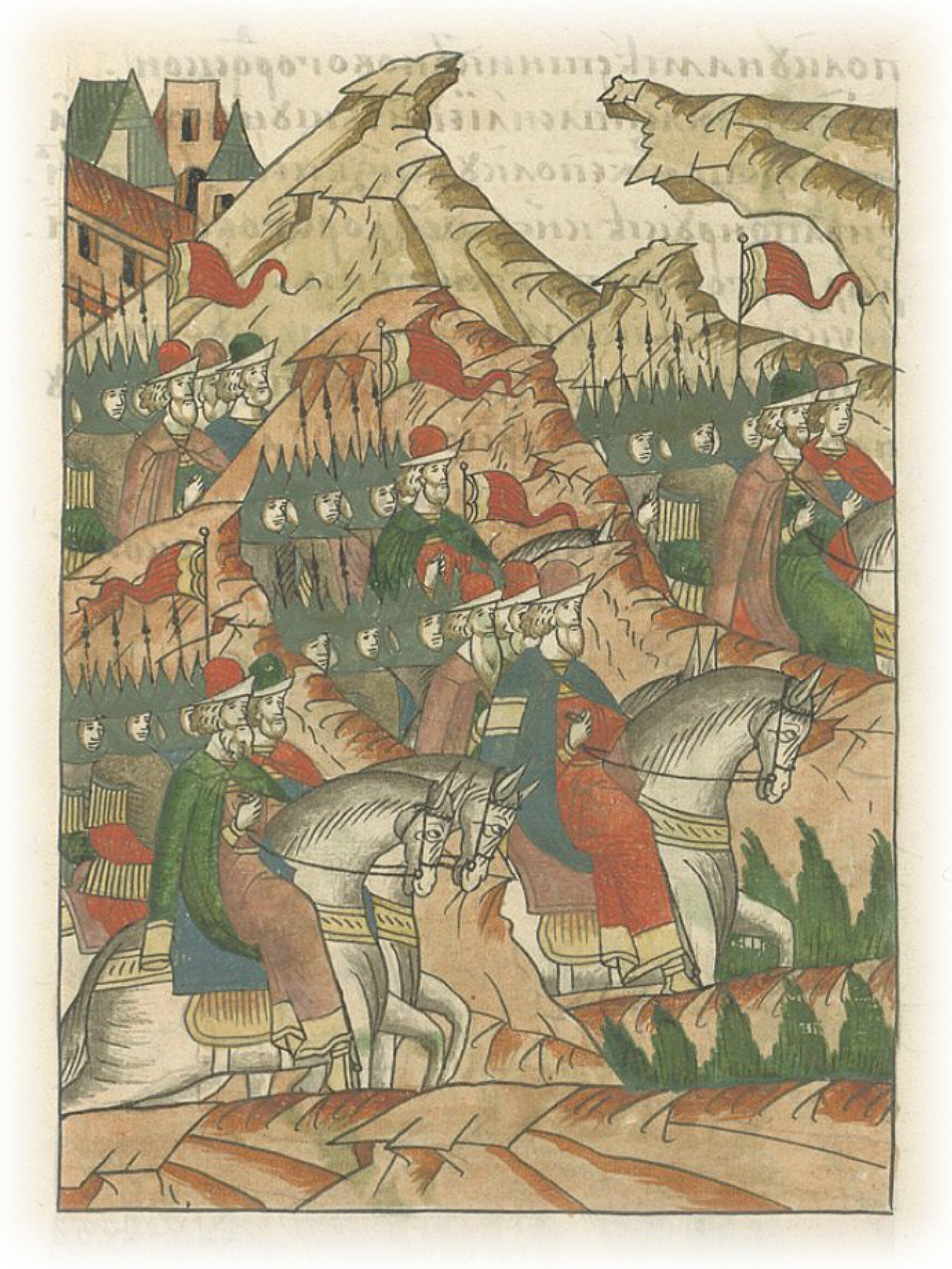 И пошли воеводы из Новгорода к Пскову: в большом полку – князь Даниил Васильевич, и в большом же полку –другой воевода князь Иван, сын князя Василия Васильевича Шуйского, и в большом же полку – третий воевода князь Борис Тебет-Уланов; в передовом полку – новгородский наместник князь Василий Васильевич Шуйский, и в передовом же полку – князь Петр Лобан; в (полку) правой руки – князь Иосиф Дорогобужский, Петр Житов; в (полку) левой руки - князь Владимир Андреевич Микулинский; в сторожевом полку – Семен Карпович, Михайло Андреевич Колычев и князь Семен Ромодановский.