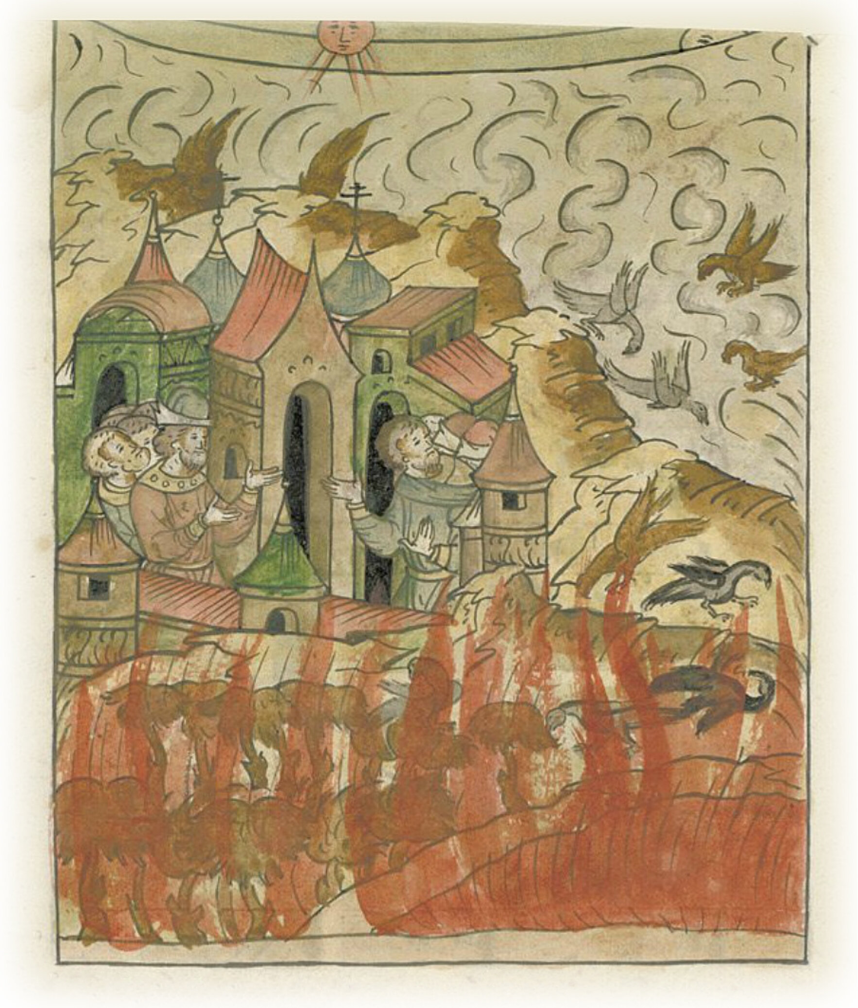 И с того времени не было дождя до сентября месяца, и была засуха и мгла великая, как дым горькая. Леса выгорели, и болота водные высохли, и в третьем часу дня явилось солнце красное, и луч сиял от него весь день, так что смотреть на него было нельзя. А после двух часов заходило и становилось невидимым; мгла такая была великая, что даже и птиц, в воздухе парящих, не было видно, и человек человека только вблизи мог видеть, а птицы на землю падали.