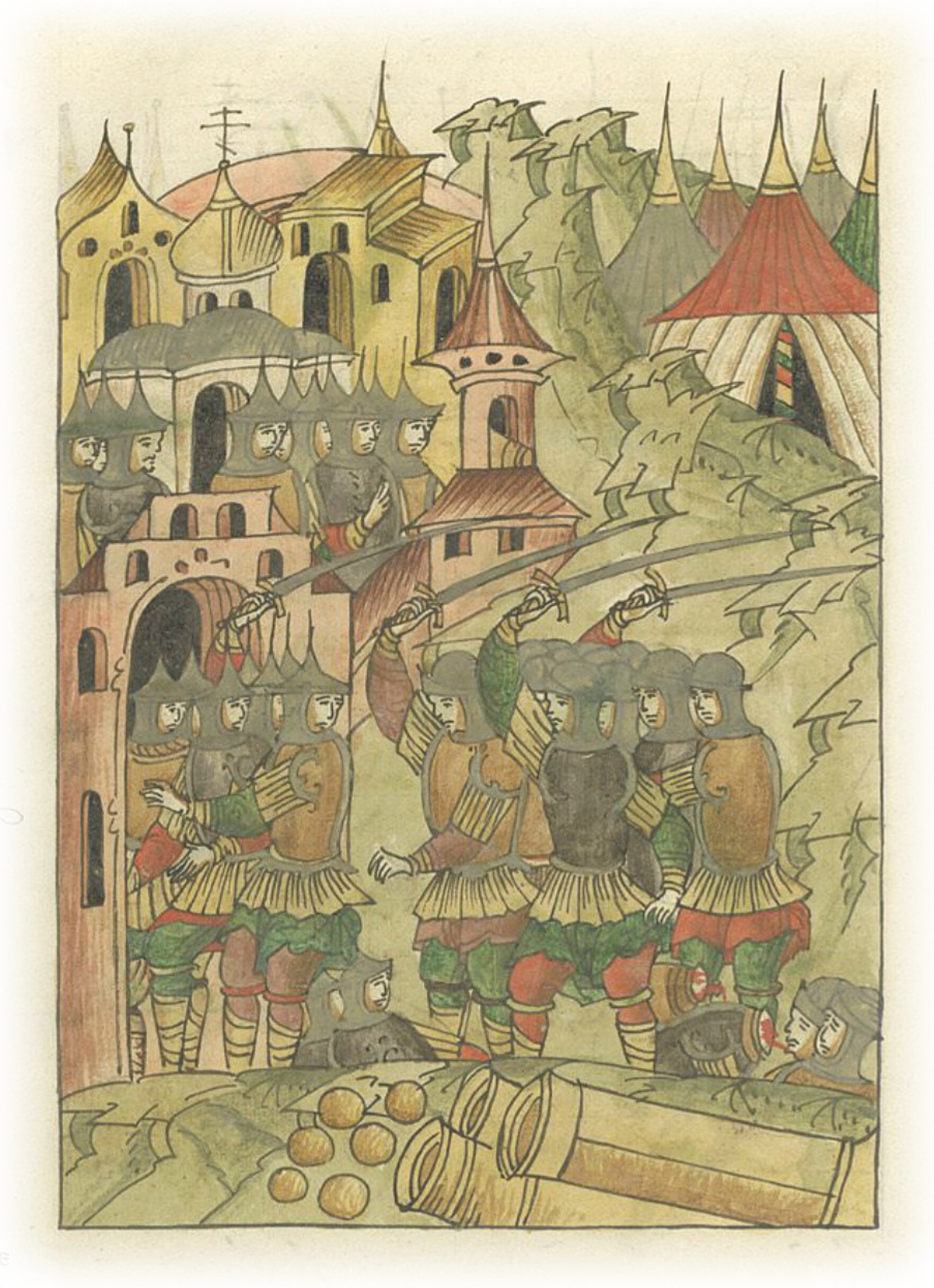 Языки говорят воеводам царя Ивана Васильевича, что магистр окопался большим рвом вокруг города Рындола, бьет из пушек и пищалей и приступает к Рындолу.