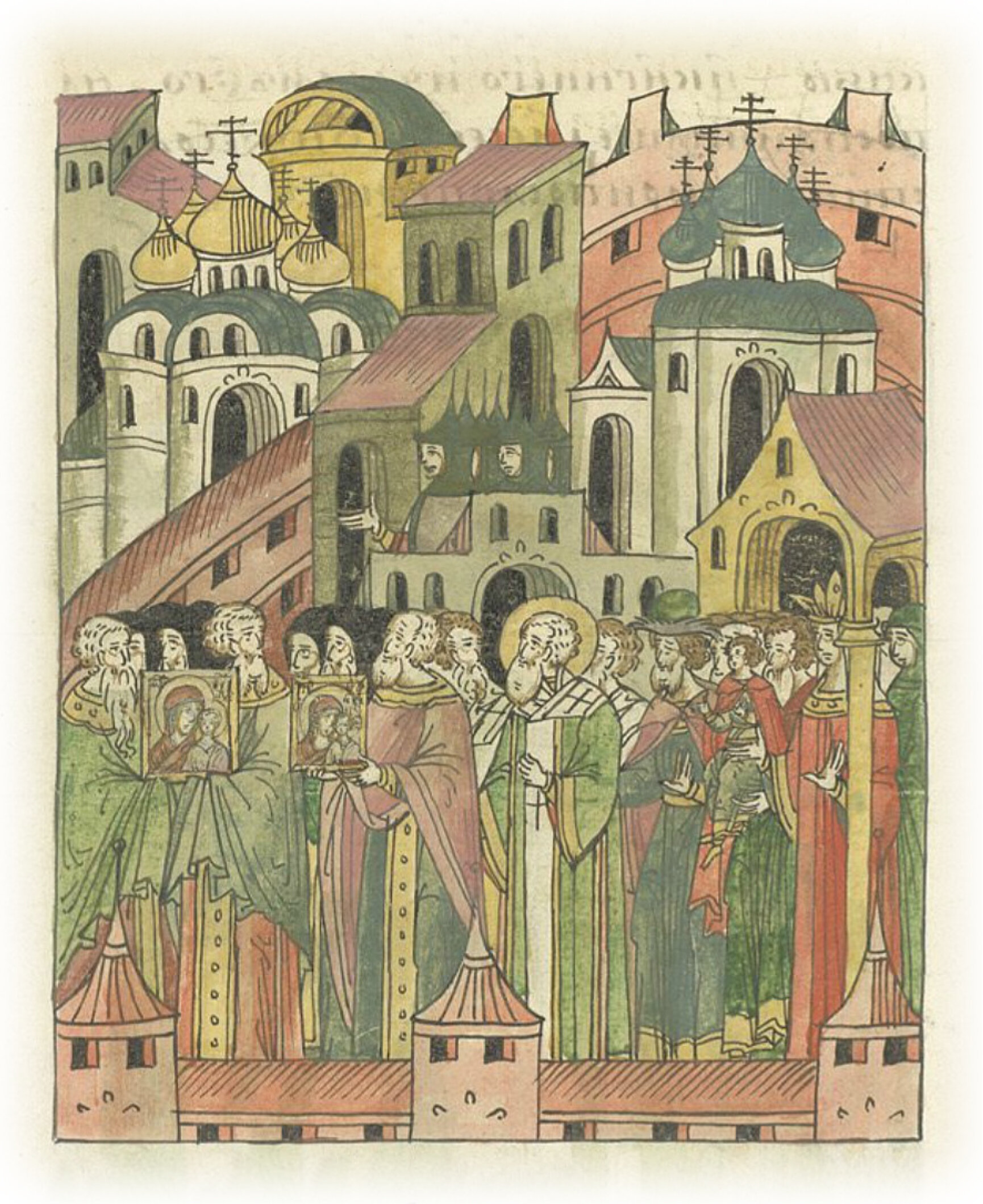 и повелел им выходить из церкви с образом пресвятой Богородицы, который он отпустил к Смоленску. И пошли, неся чýдную икону пресвятой Богородицы; за ним последовал и митрополит с освященным собором, неся с собою и ту икону, которая оставлена на благословение великому князю. Следом за ними шел великий князь с чадами своими, с князьями и с боярами. На Москве тогда было многое множество воинства, и все они пошли следом и весь народ славного города Москвы.