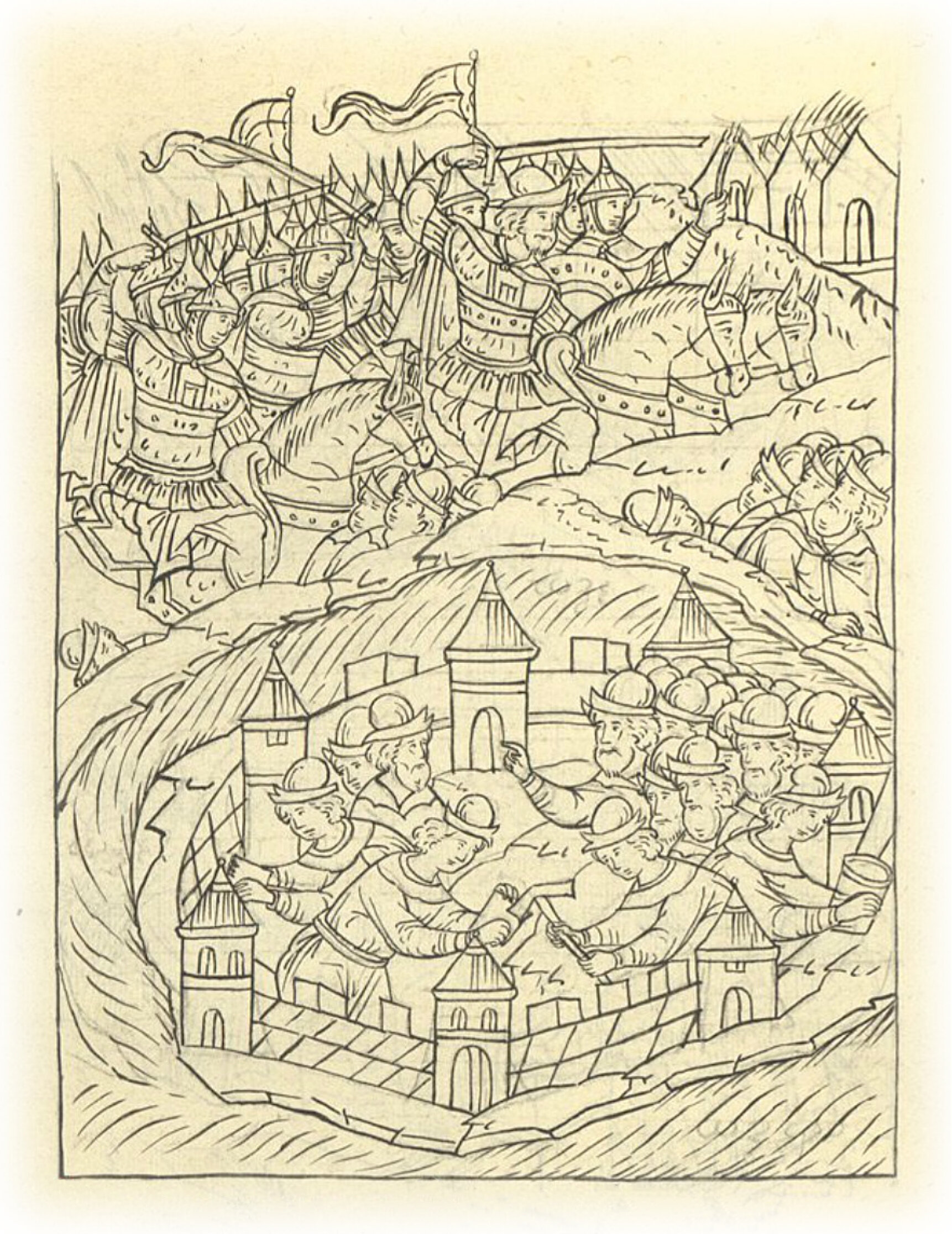 Языки говорят воеводам царя Ивана Васильевича, что магистр окопался большим рвом вокруг города Рындола, бьет из пушек и пищалей и приступает к Рындолу.