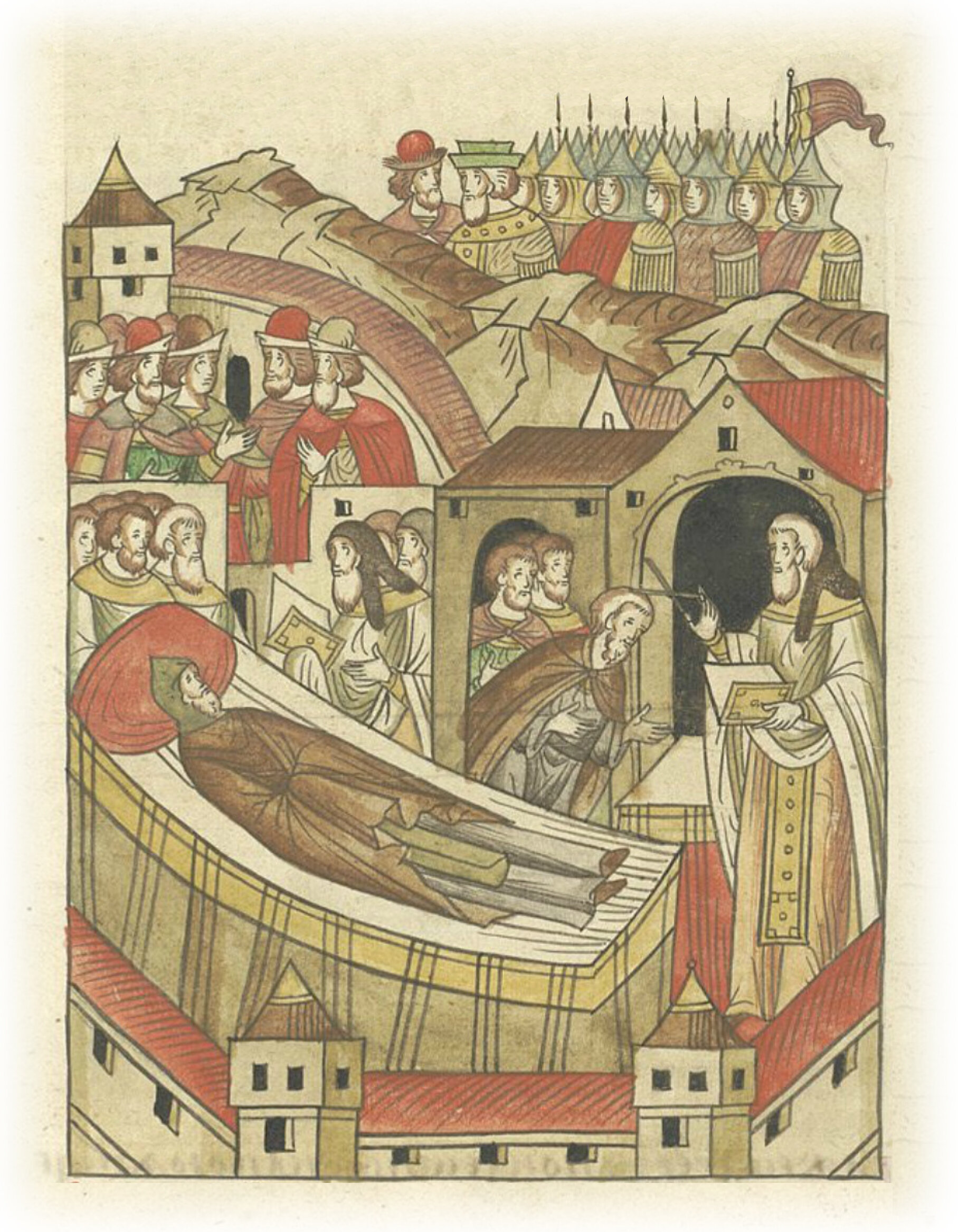 в тот же час постригся в иноческий чин и преставился. Был этот князь очень храбр и прославлен своими победами, любил он священнический и иноческий чин, желал умереть постриженным в иноческий чин, и его желания не презрел Бог.