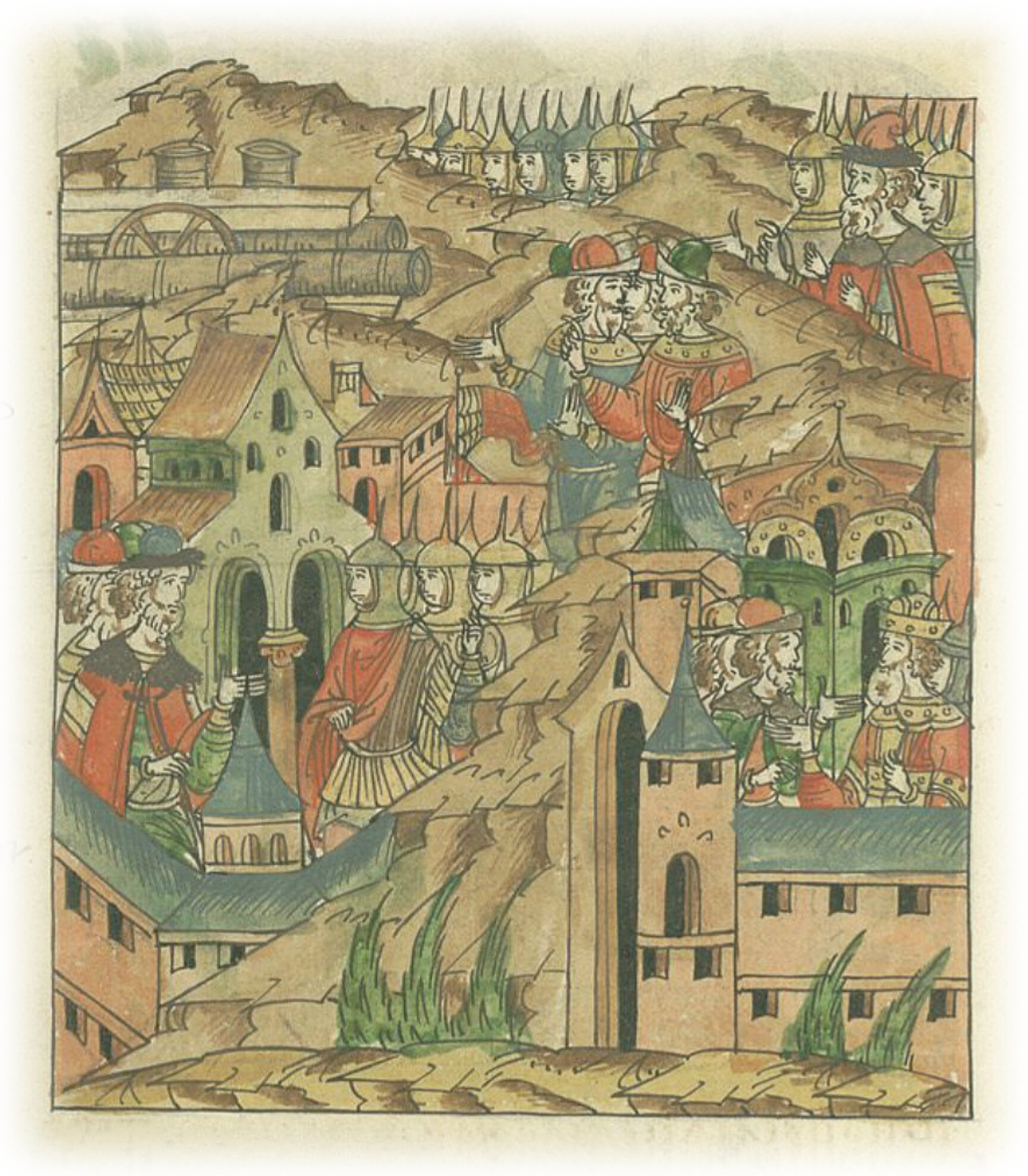Языки говорят воеводам царя Ивана Васильевича, что магистр окопался большим рвом вокруг города Рындола, бьет из пушек и пищалей и приступает к Рындолу.