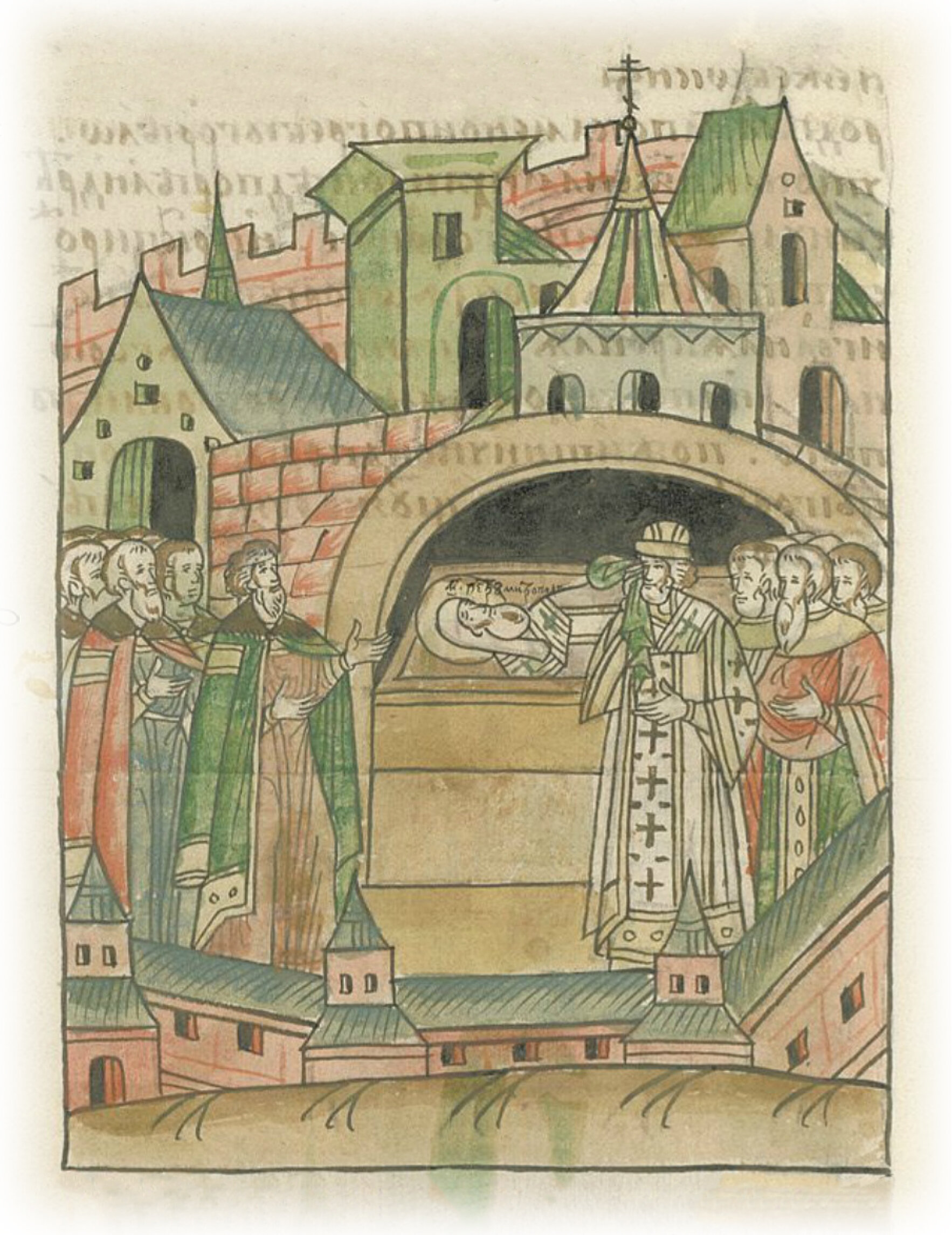 И войдя в церковь Пречистой, начал молебен петь со многими слезами у гроба чудотворца Петра. Тогда же в то время пришел туда и сам великий князь, и, увидев его плачущим, начал говорить ему: «Отче, господине! Не скорби, так Бог изволил, а что двор погорел твой, то я тебе сколько хочешь хором дам; или если какой запас погорел, то все у меня возьми»; думал, что он о том плакал.