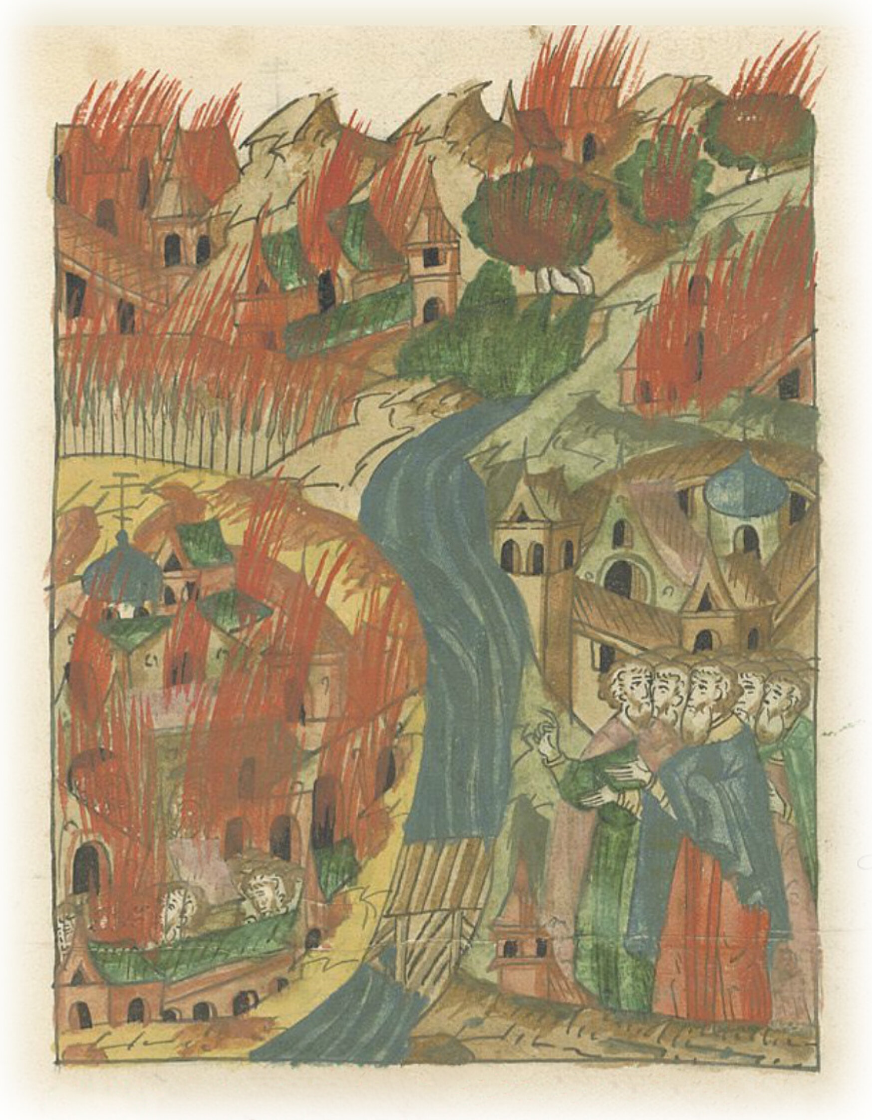 О великом новгородском пожаре. В том же году была сильная засуха, и много городов выгорело, также и сел, и лесов, и хлеба, и травы много выгорело; а в Великом Новгороде – полгорода, Торговая сторона вся выгорела, а людей в Новгороде 2700 человек сгорело за наши грехи.