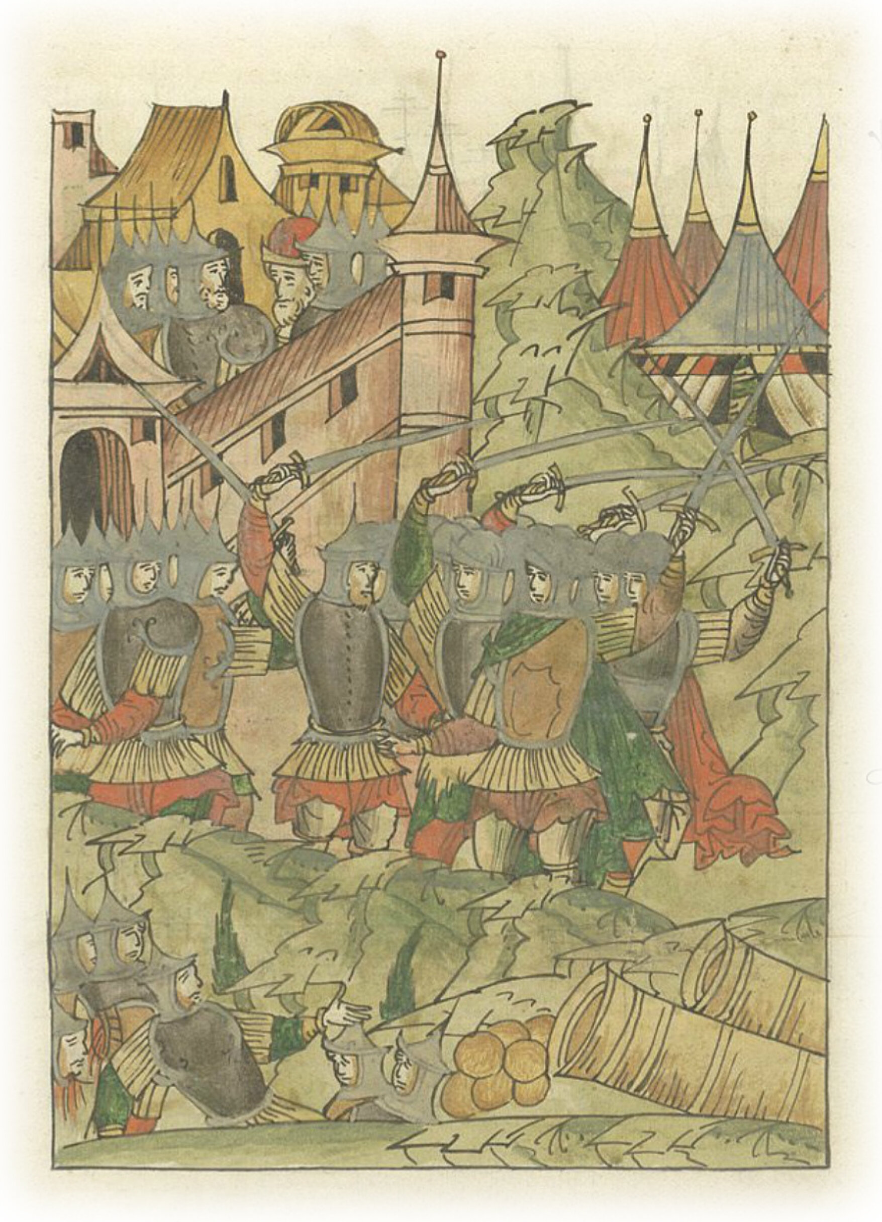 Языки говорят воеводам царя Ивана Васильевича, что магистр окопался большим рвом вокруг города Рындола, бьет из пушек и пищалей и приступает к Рындолу.