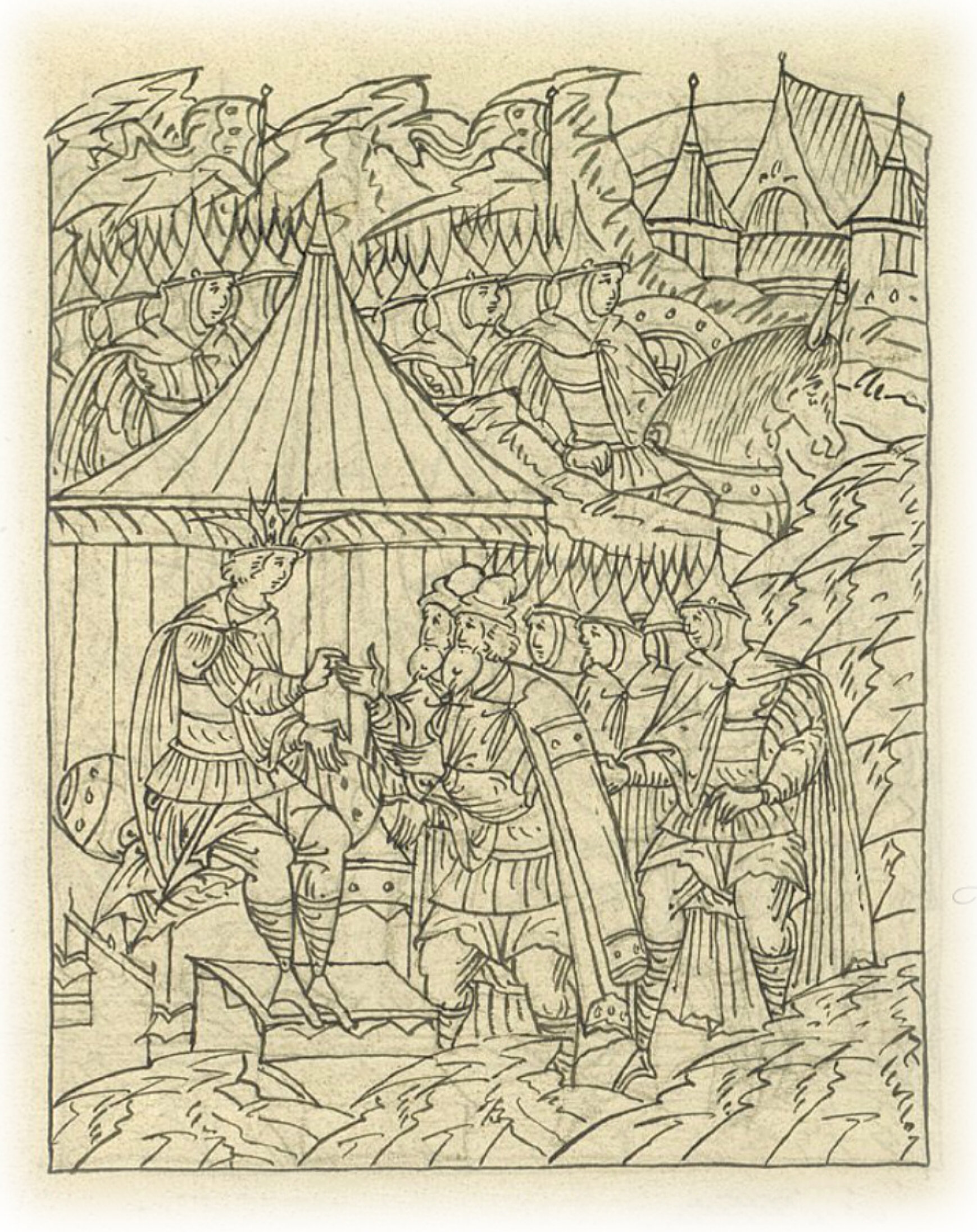 Языки говорят воеводам царя Ивана Васильевича, что магистр окопался большим рвом вокруг города Рындола, бьет из пушек и пищалей и приступает к Рындолу.