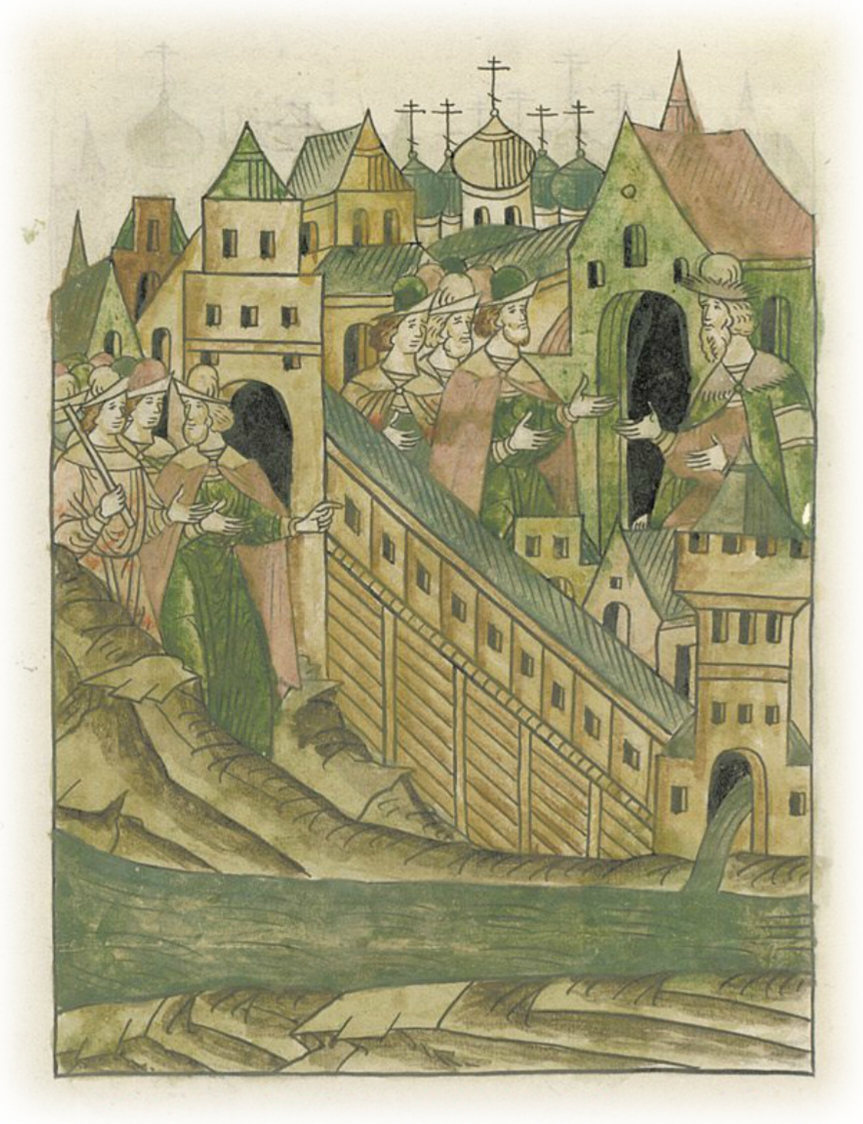 О деревянной стене, что (построили) в Москве. В том же году поставили деревянную стену от Никольской стрельницы* до тайника на Неглинной. * башня в укреплении.