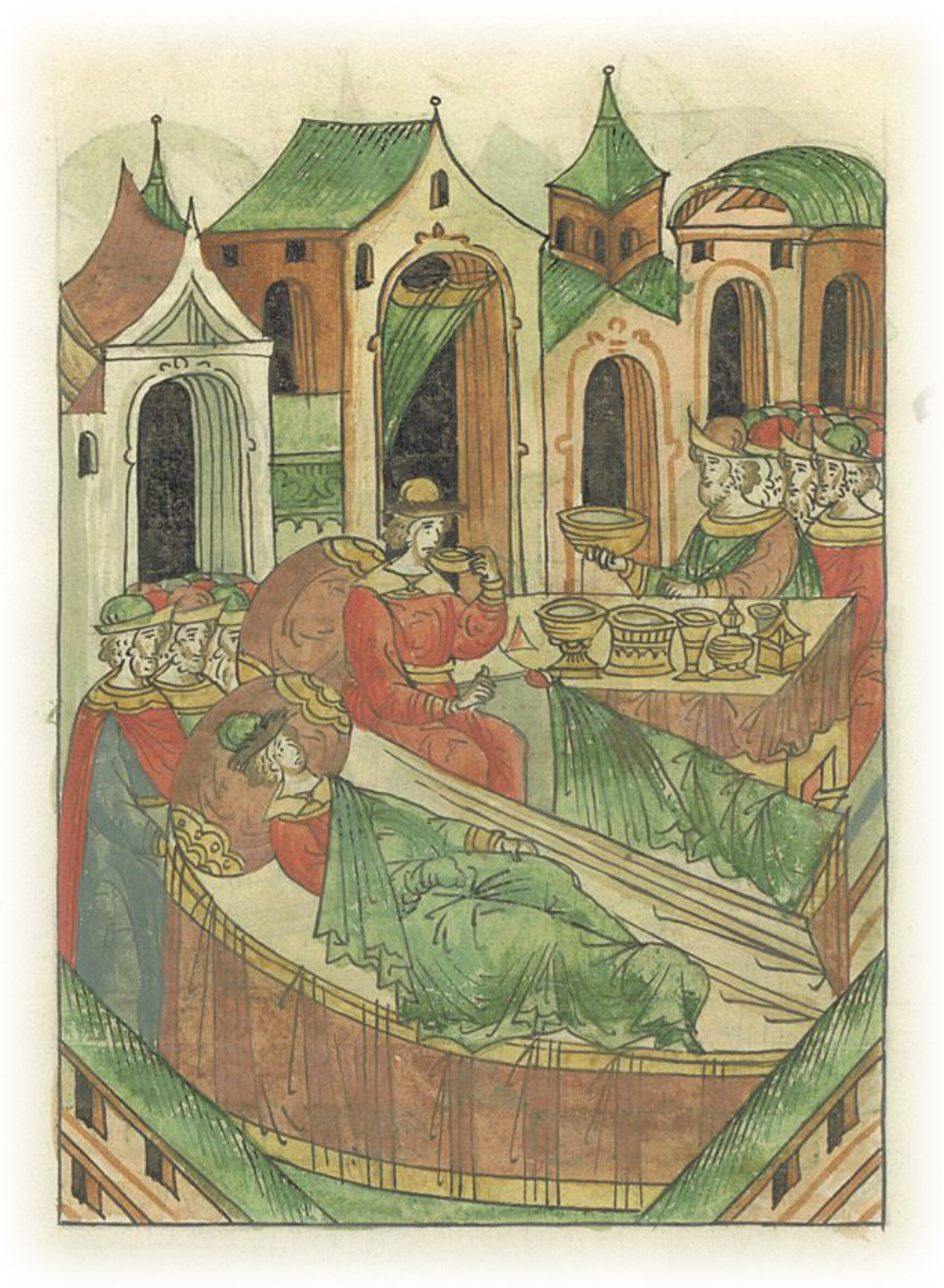 О кончине князя Дмитрия Юрьевича Красного. Поев и выпив вина, князь просит всех приближенных уйти, дав ему покой.