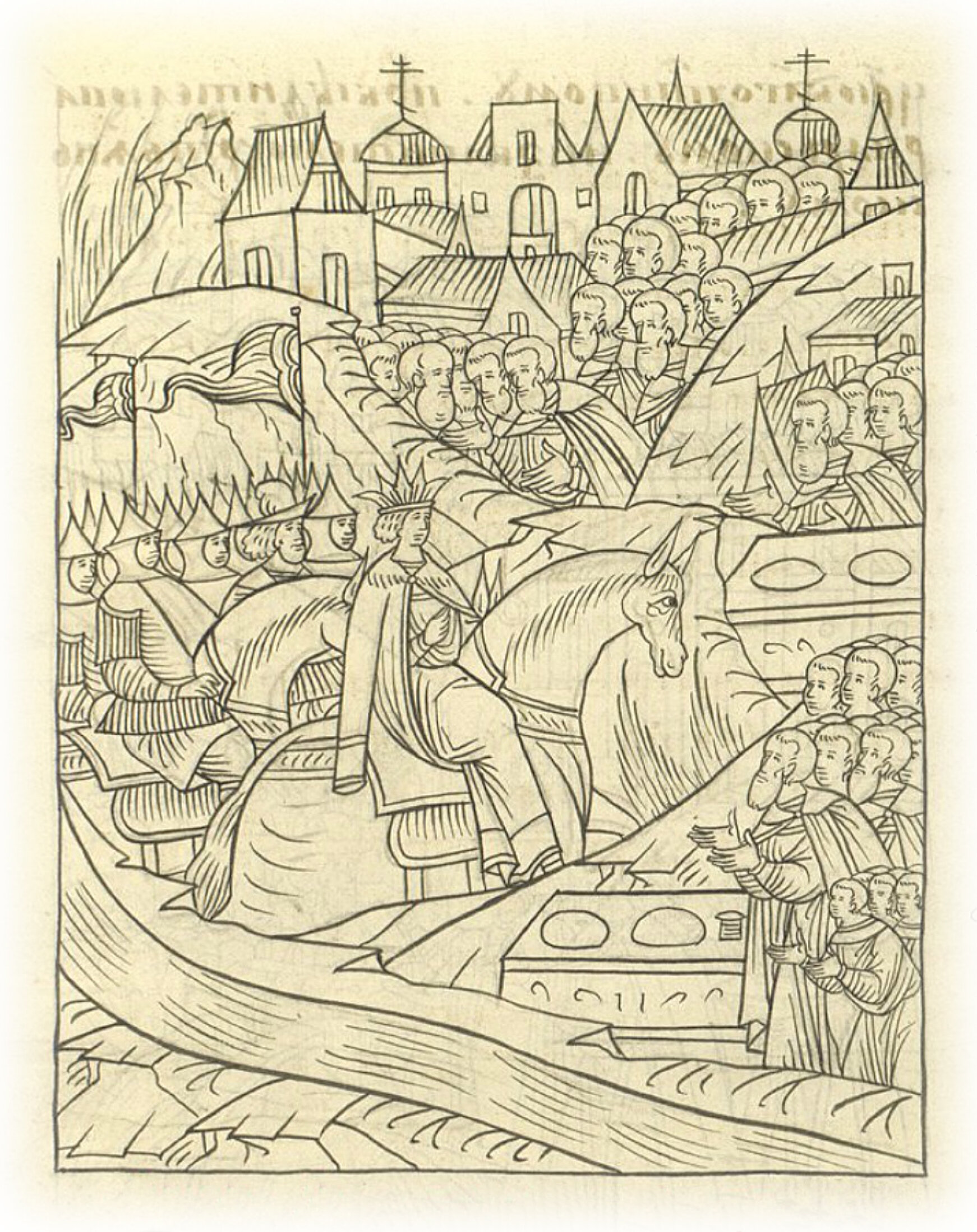 О приходе царском к Москве. В том же месяце пришел государь к царствующему своему городу Москве, и встречало государя (такое) множество народа, какое и поля не вмещали: от реки Яузы до посада и по самый город, по обе стороны пути, бесчисленно народа. Старые и юные громкими голосами кричали; и ничего иного не было слышно, только: «Многая лета царю благочестивому, победителю варварскому и избавителю христианскому!»