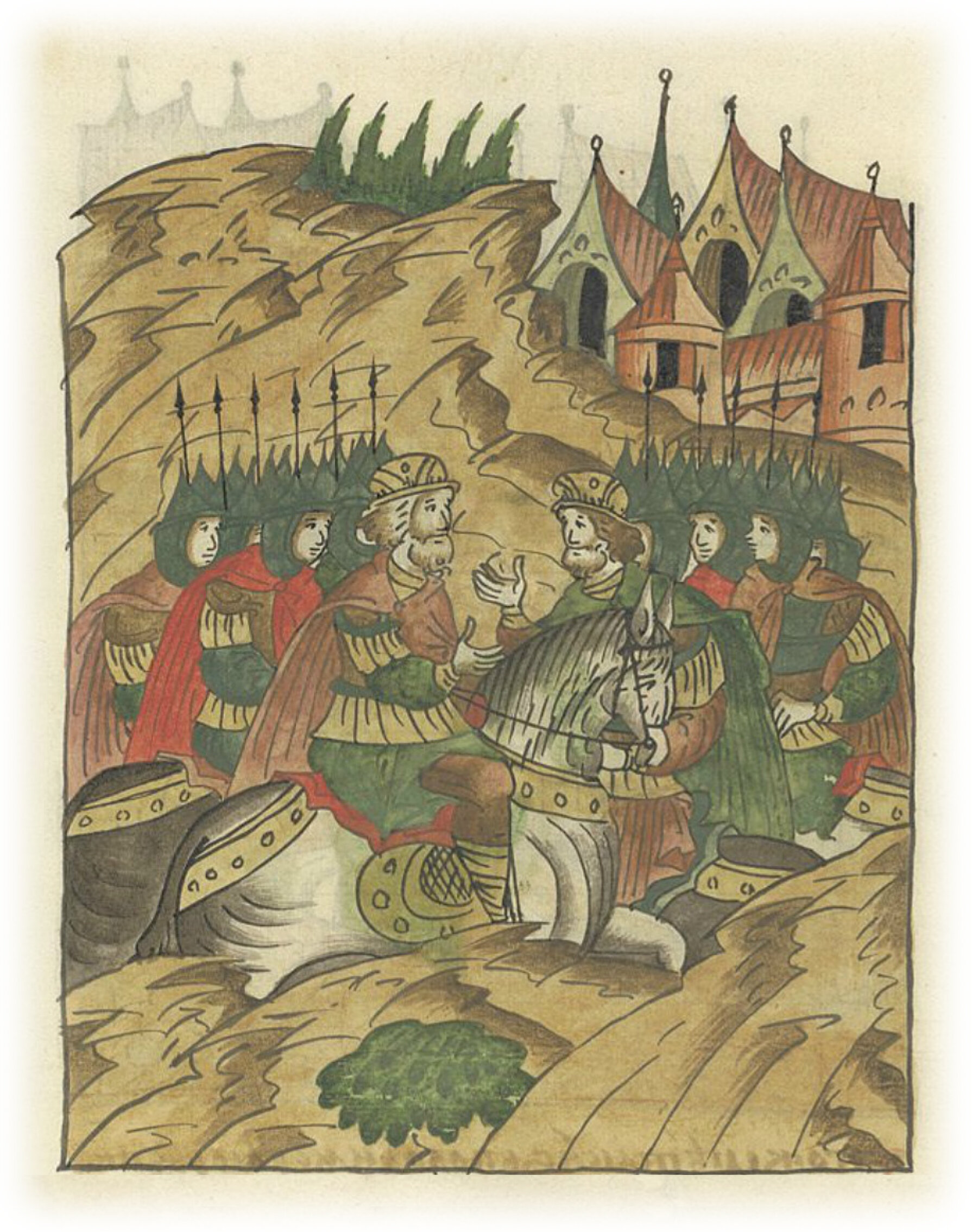 Князь Юрий Всеволодович с братьями Ярославом и Иоанном идет на съезд с братьями Константином и Владимиром, и у Юрьева братья мирятся.