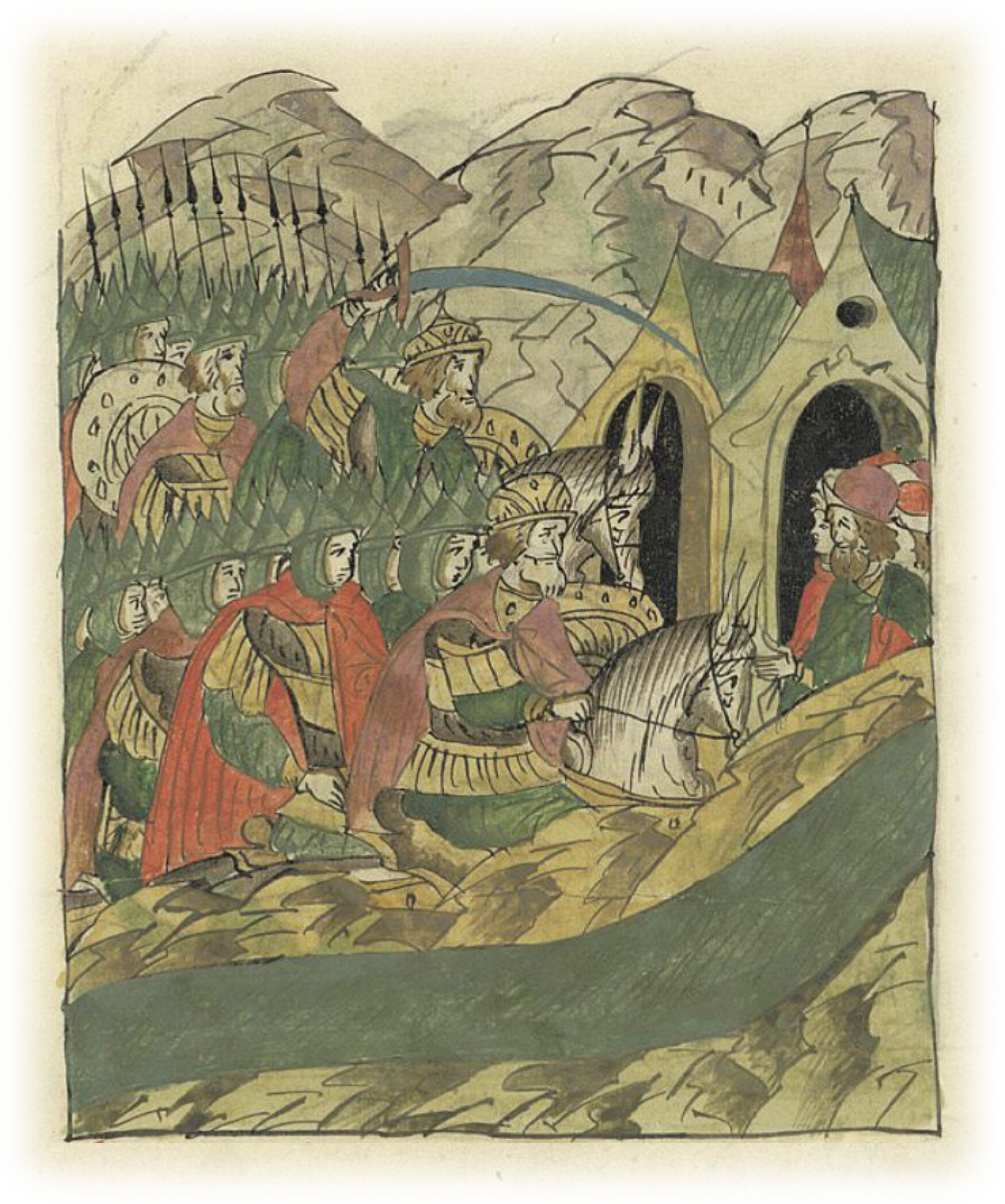 И пошли полк за полком, бьюще в бубны, дудя в трубы и в сопели, а сам князь шел за ними. Болгары же, идущие по берегу, видели своих полоненых: один – отца, другой – сына или дочь, иной же – братьев и сестер с племянниками, и встали, понуря головы свои, и стенали сердца их, и не могли они смотреть на это.