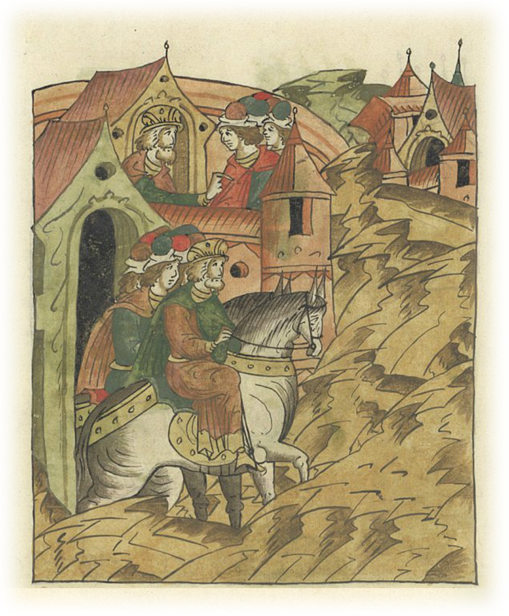 Ругодивские посадники Яким и Захар приезжают в Москву. Воеводы царя Ивана Васильевича Алексей Адашев и Иван Михайлов сообщают им, что государь пожалует их, если сдадут его воеводам помимо Ругодива Вышгород.